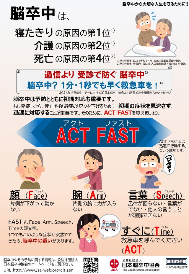 制作・著作 公益社団法人日本脳卒中協会 転載される場合は、日本脳卒中協会([email protected])にお問い合わせください。啓発目的で制作しました資材です。本資材の一部または全部について商用でご利用は固くお断りいたします。