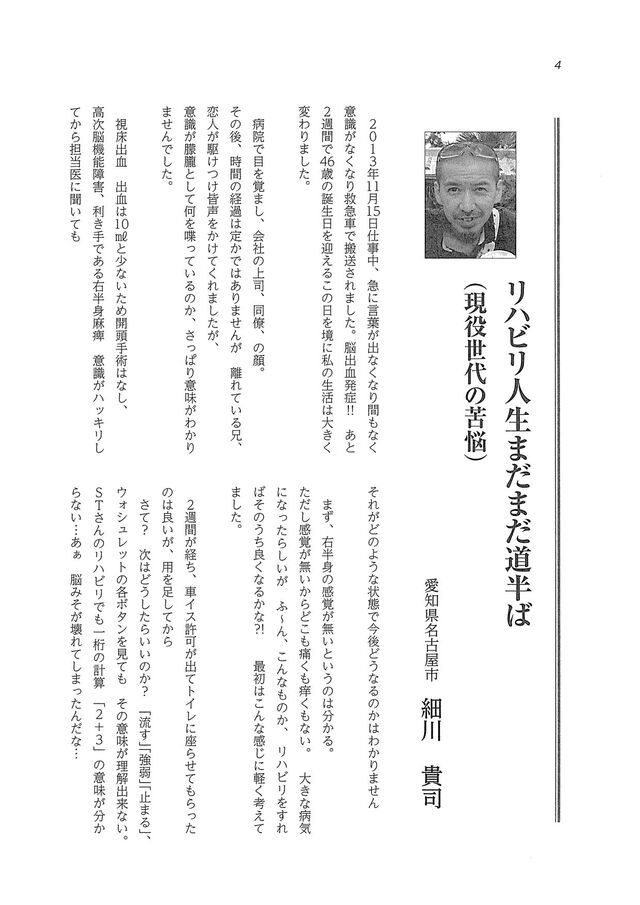 脳卒中後の私の人生 第18回 優秀賞受賞作品 「リハビリ人生まだまだ道半ば(現役世代の苦悩)」細川貴司さん作 転載される場合は、日本脳卒中協会([email protected])にお問い合わせください。
