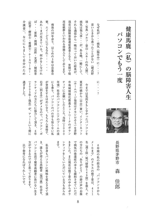 脳卒中後の私の人生 第12回 優秀賞受賞作品 「健康馬鹿(私)の脳障害人生 パソコンでもう一度」森 佳郎さん作 転載される場合は、日本脳卒中協会([email protected])にお問い合わせください。