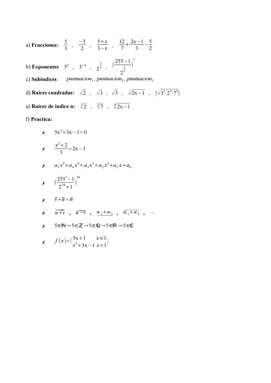 , 12 7 + 2x−1 3 − 5 2 b) Exponentes 52 , 3−4 , 2 1 2 , ( 255−1 2 1 5 ) 3 c) Subíndices: puntuacion 1 , puntuacion 2 , puntuacion 3 d) Raíces cuadradas: √2 , √3 , √5 , √2x−1 , (√33⋅24⋅75) e) Raíces de índice n: 3 √2 , 5 √7 , 4 √2x−1 f) Practica: ✗ 5x2+3x−1=0 ✗ x2+2 3 =2x−1 ✗ a 5 x5+a 4 x4+a 3 x3+a 2 x2+a 1 x+a 0 ✗ ( 2553−1 234+1 ) 10 ✗ ⃗ v+⃗ u=⃗ w ✗ ⃗ u+v , ̃ u−v , w 1 +w 2 , w 1 +w 2 , ⋯ ✗ 5∈ℕ→5∈ℤ→5∈ℚ→5∈ℝ →5∈ℂ ✗ f (x)={ 5x+1 x⩽1 x2+3x−1 x>1 }