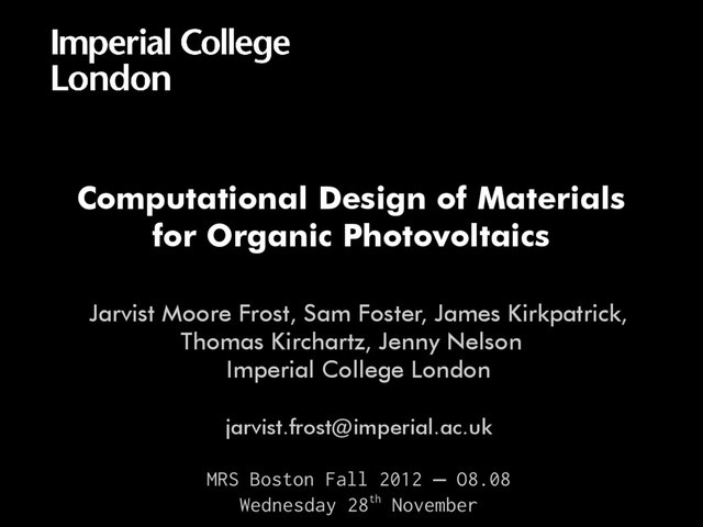 Sam Foster, James Kirkpatrick, Thomas Kirchartz, Jenny Nelson Imperial College London [email protected] MRS Boston Fall 2012 O8.08 – Wednesday 28th November