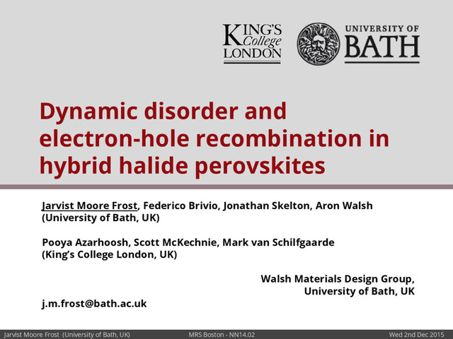 NN14.02 Wed 2nd Dec 2015 Jarvist Moore Frost, Federico Brivio, Jonathan Skelton, Aron Walsh (University of Bath, UK) Pooya Azarhoosh, Scott McKechnie, Mark van Schilfgaarde (King’s College London, UK) Walsh Materials Design Group, University of Bath, UK [email protected] Dynamic disorder and electron-hole recombination in hybrid halide perovskites