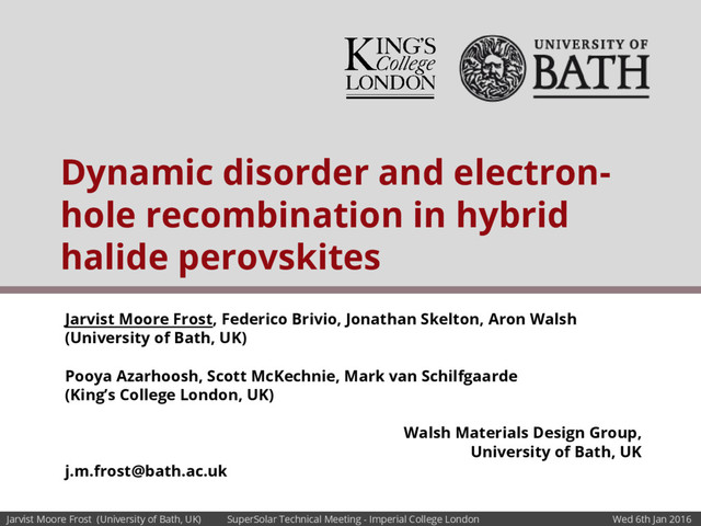 - Imperial College London Wed 6th Jan 2016 Jarvist Moore Frost, Federico Brivio, Jonathan Skelton, Aron Walsh (University of Bath, UK) Pooya Azarhoosh, Scott McKechnie, Mark van Schilfgaarde (King’s College London, UK) Walsh Materials Design Group, University of Bath, UK [email protected] Dynamic disorder and electron- hole recombination in hybrid halide perovskites