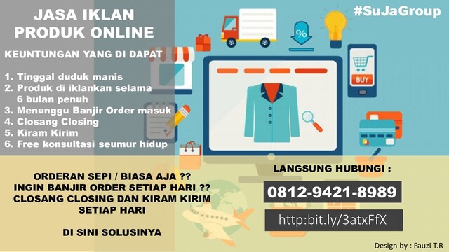 duduk manis 2. Produk di iklankan selama 6 bulan penuh 3. Menunggu Banjir Order masuk 4. Closang Closing 5. Kiram Kirim 6. Free konsultasi seumur hidup ORDERAN SEPI / BIASA AJA ?? INGIN BANJIR ORDER SETIAP HARI ?? CLOSANG CLOSING DAN KIRAM KIRIM SETIAP HARI DI SINI SOLUSINYA LANGSUNG HUBUNGI : 0812-9421-8989 #SuJaGroup Design by : Fauzi T.R http:bit.ly/3atxFfX