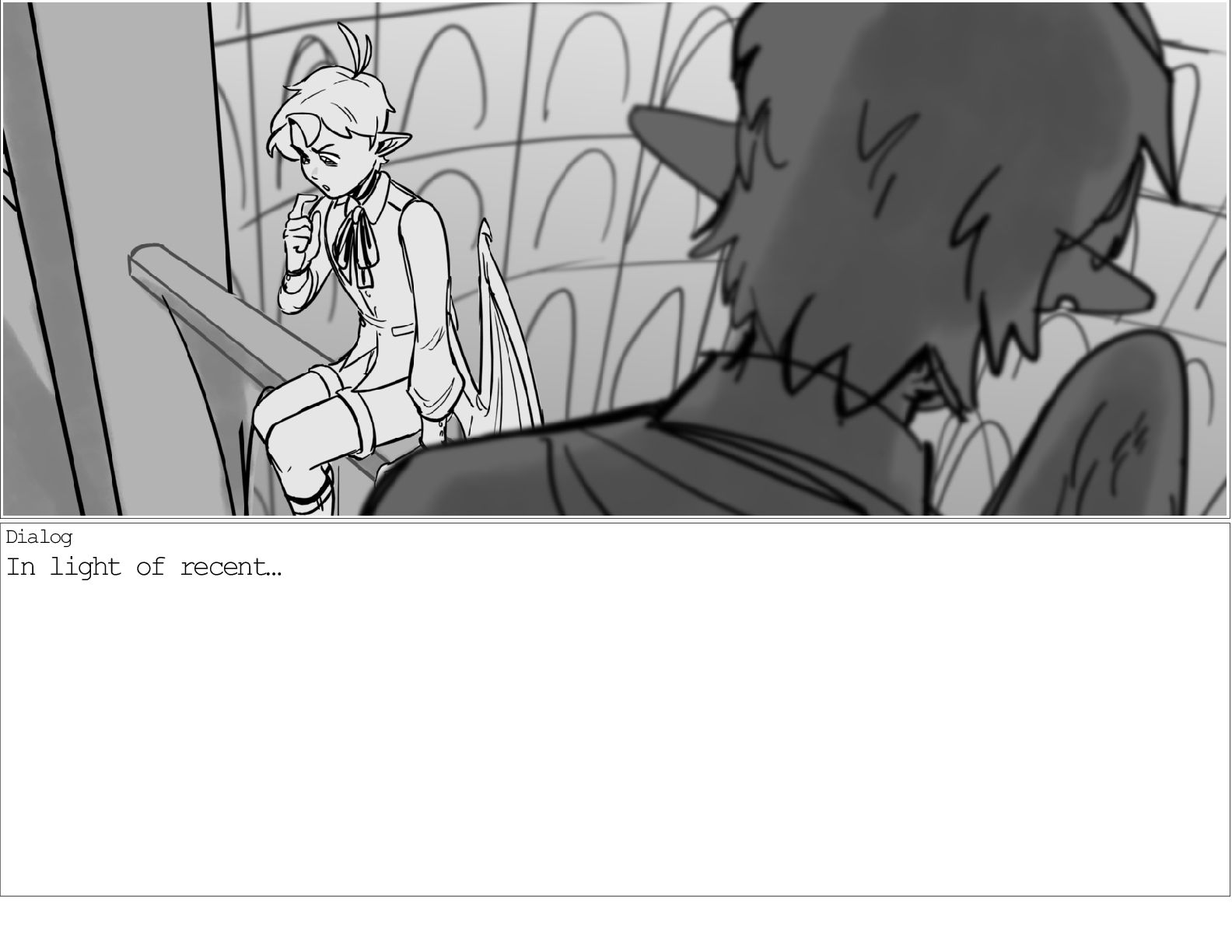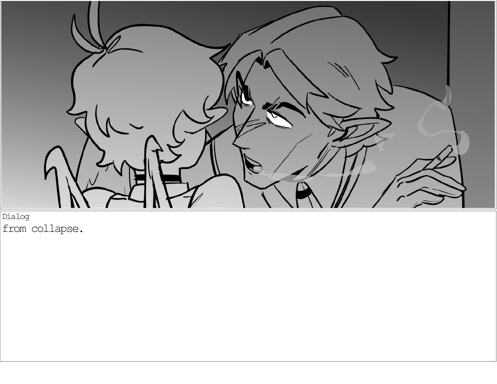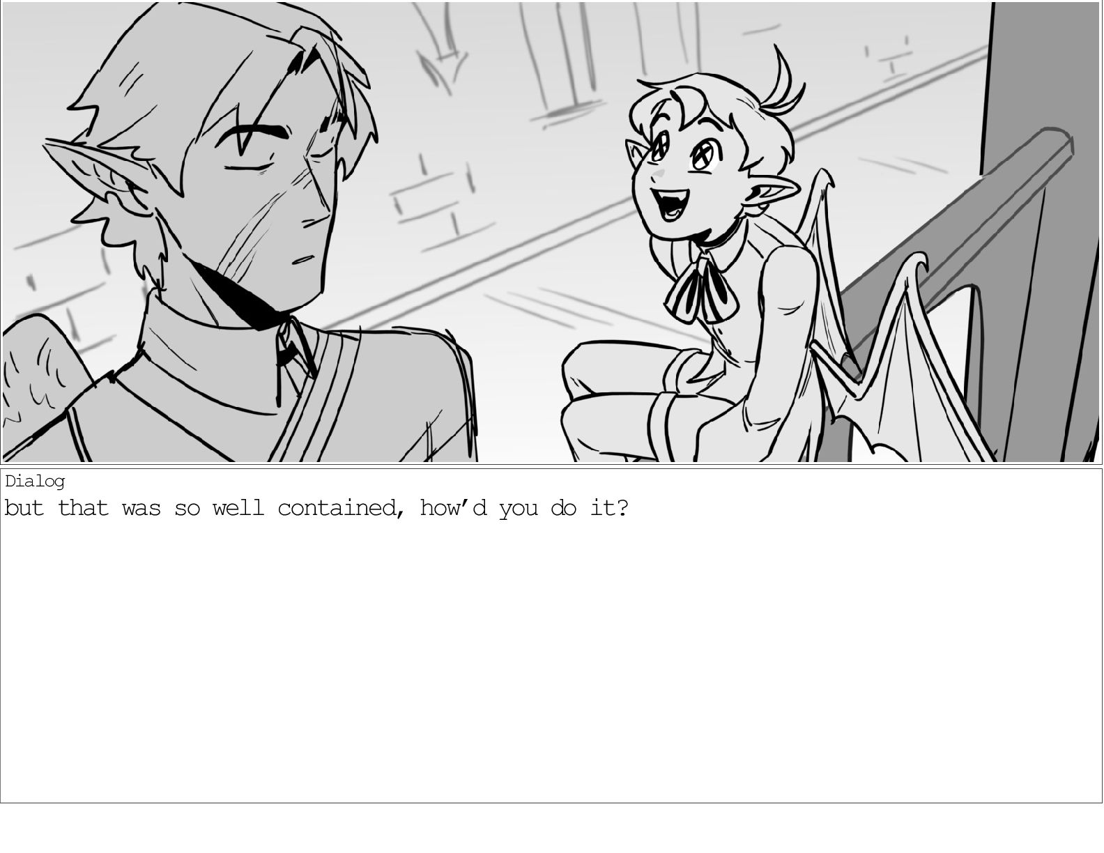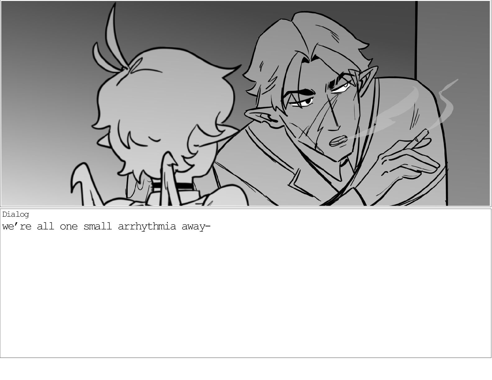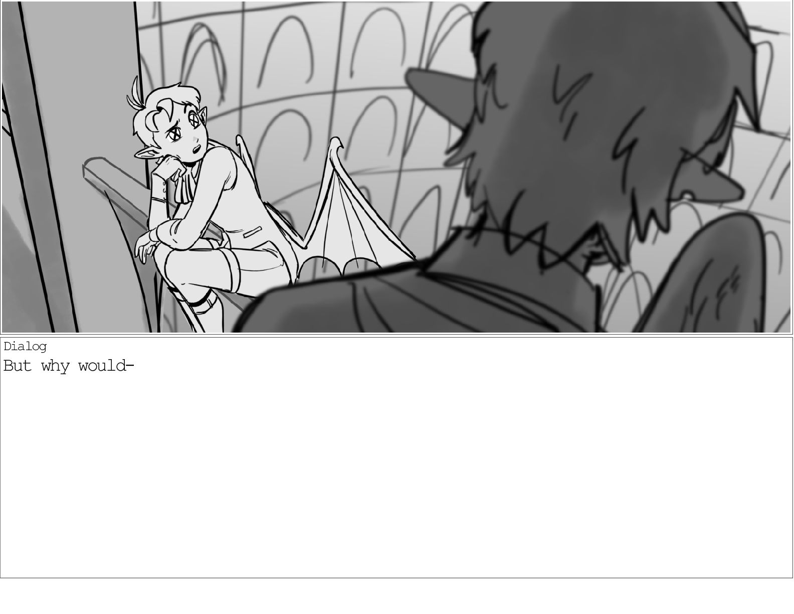 A dialogue scene between two characters from my webcomic Contingency. Done during a dialogue workshop with Warrior Art Camp. Instructor: Alex Chiu