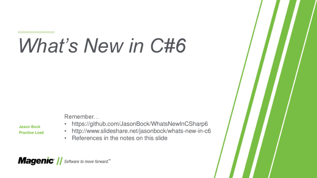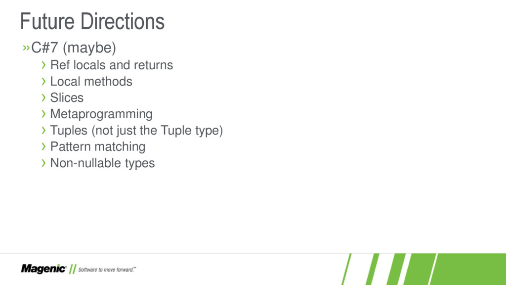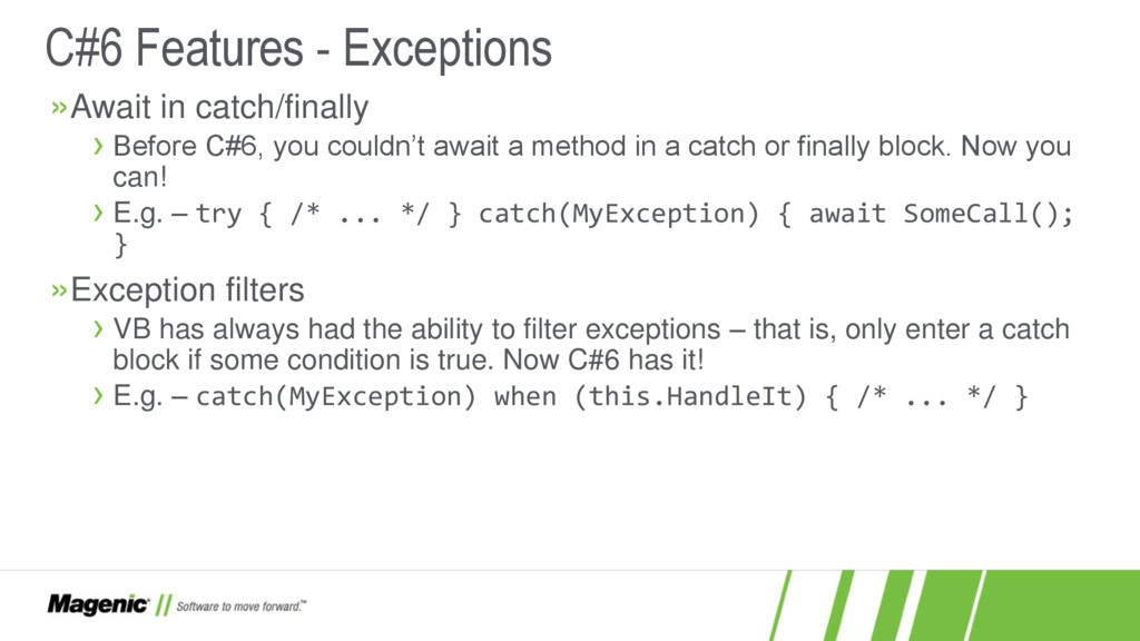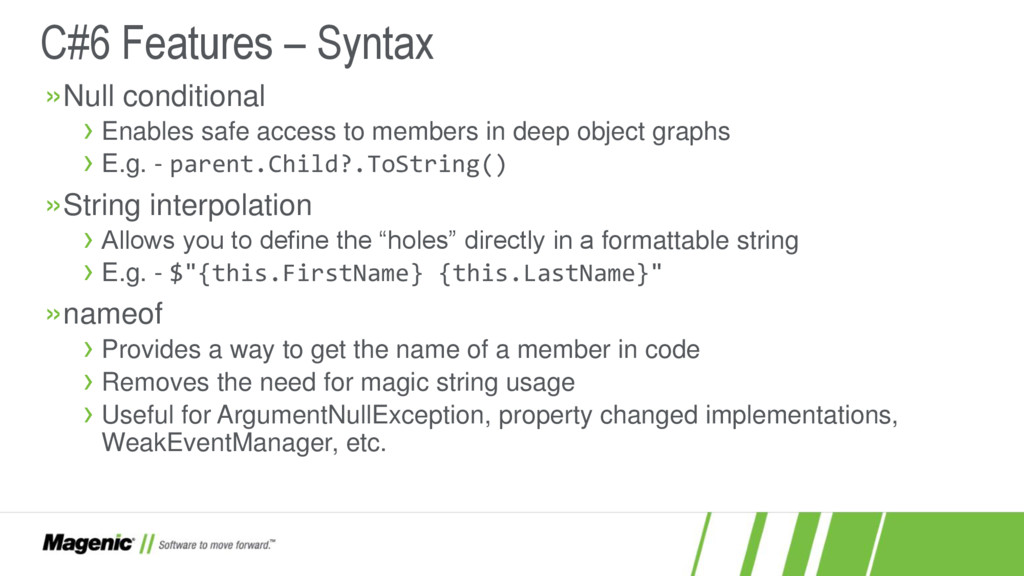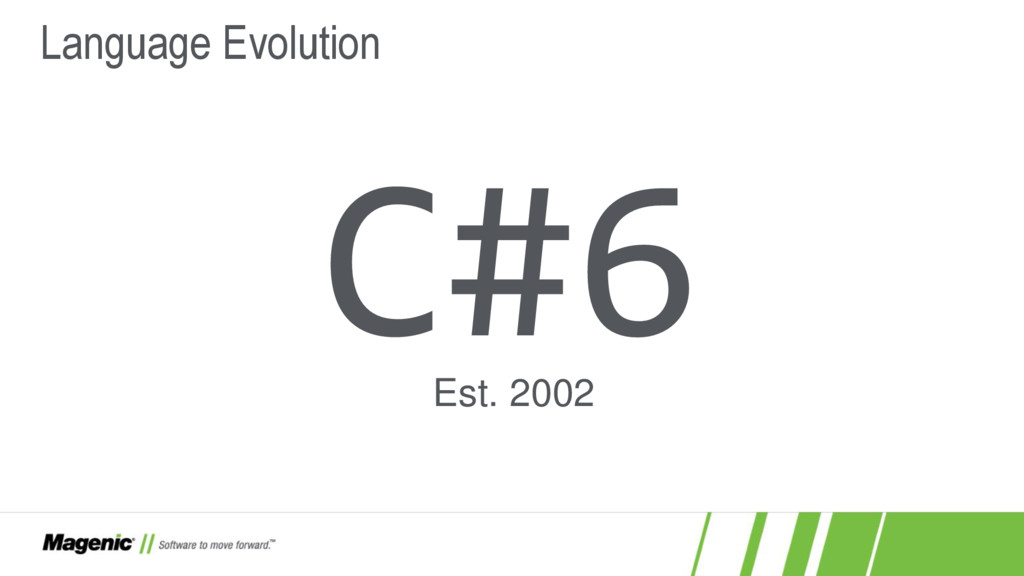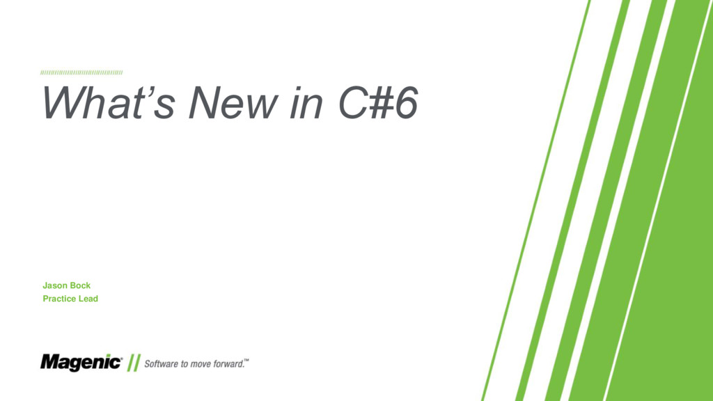 Dissatisfied that C#5 only added async and await? In C#6 you now have a lot more features! In this session we'll cover what these features are (e.g. nameof and string interpolation) and how they work in detail so you'll know when to use them effectively in your new .NET projects. You'll also see where C# is going with proposed features for C#7.