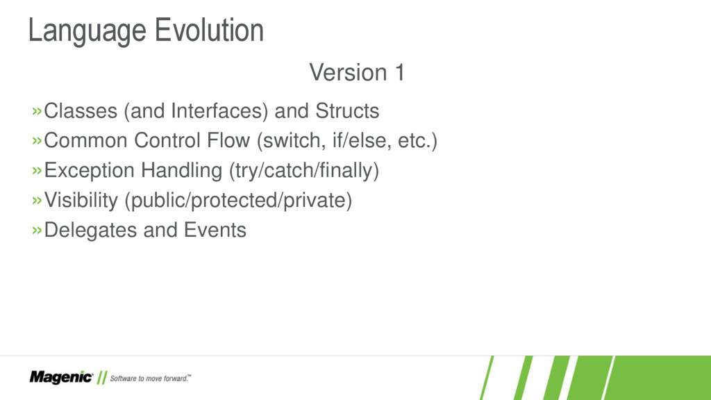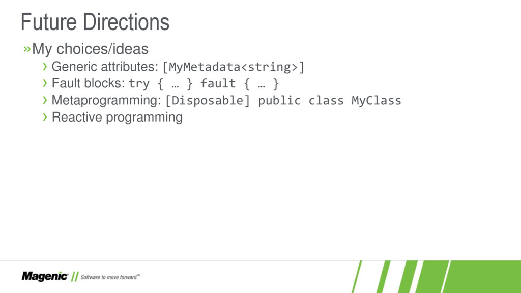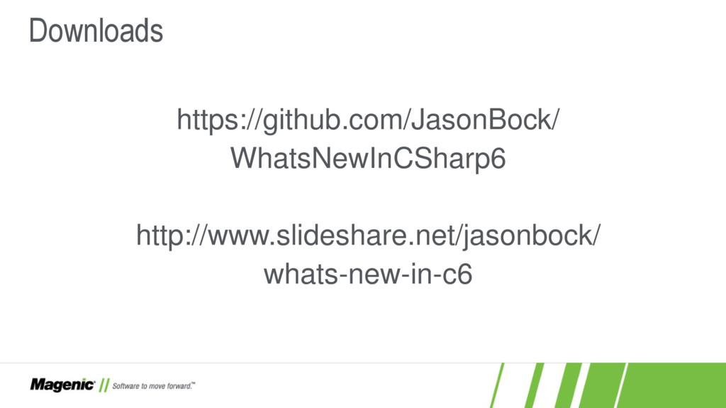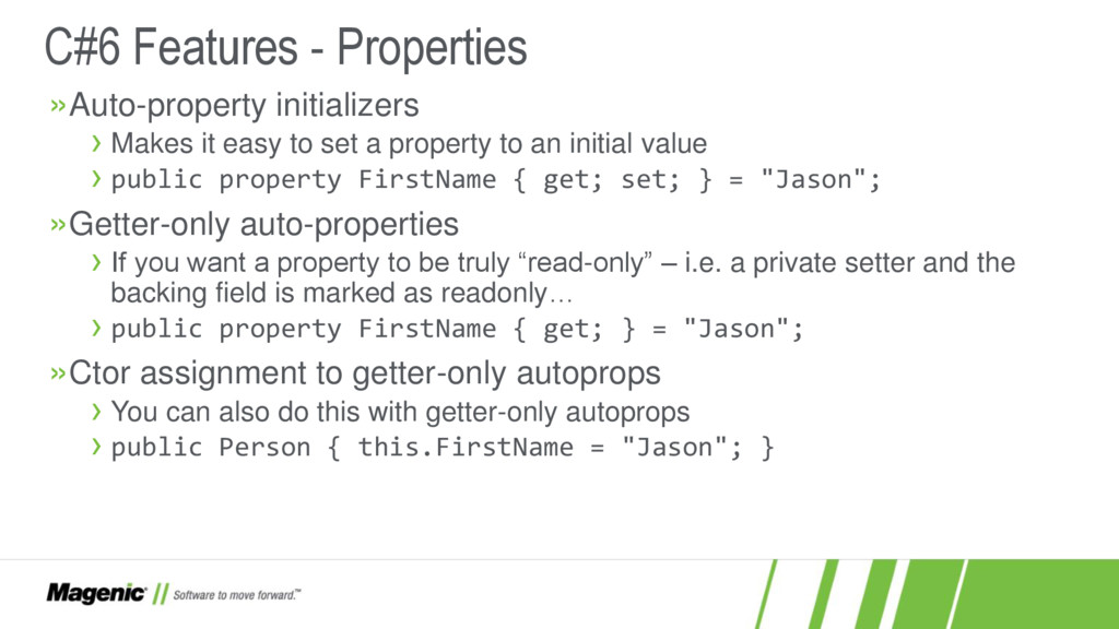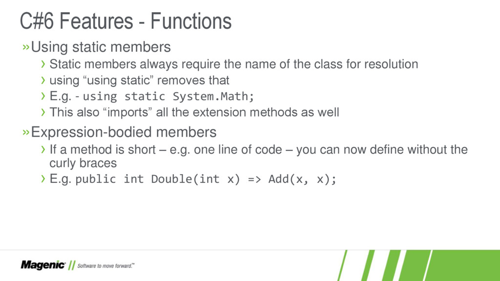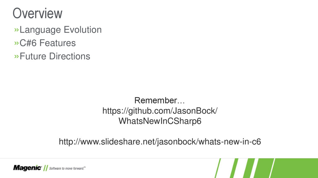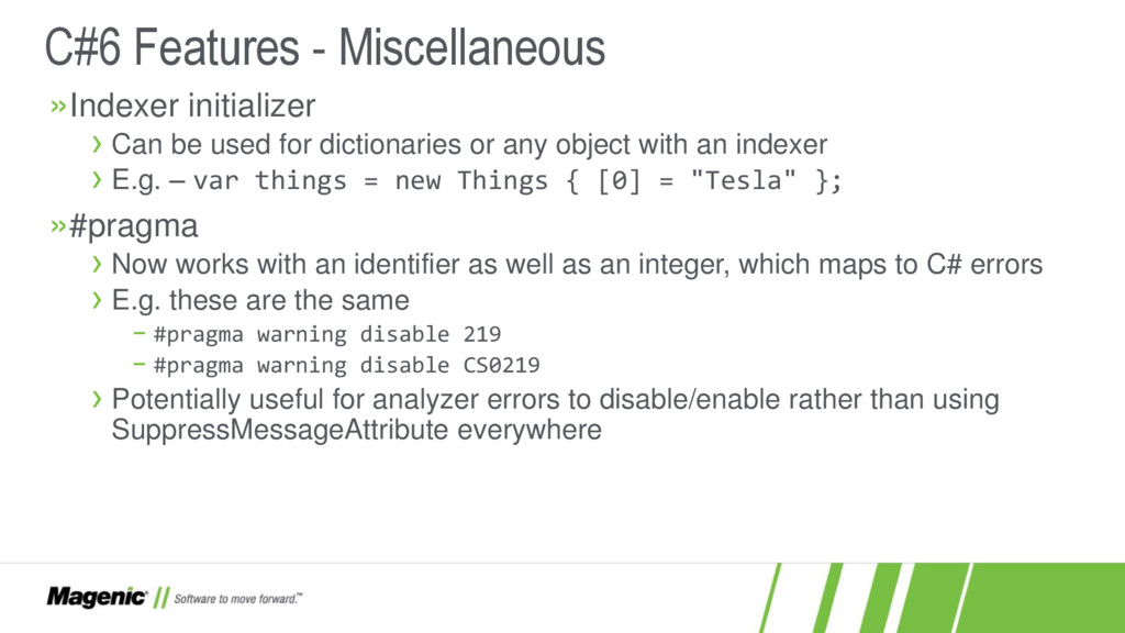 Dissatisfied that C#5 only added async and await? In C#6 you now have a lot more features! In this session we'll cover what these features are (e.g. nameof and string interpolation) and how they work in detail so you'll know when to use them effectively in your new .NET projects. You'll also see where C# is going with proposed features for C#7.