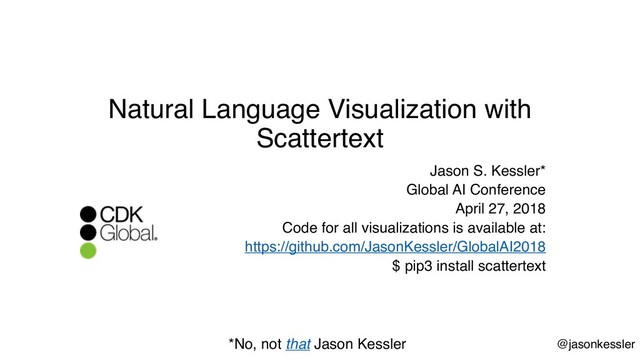 Scattertext is a Python package that lets you compare and contrast how words and phrases are used differently in two types of documents, producing interactive, Javascript-based visualizations. This talk will cover the use of Scattertext, issues in creating dense scatterplots, and discuss statistical term-association and phrase identification algorithms. The code used in the talk will be available as a repository on my Github account, http://www.github.com/JasonKessler/GlobalAI2018