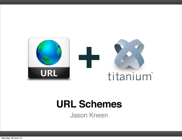 start and resume events if (Ti.App.getArguments().url) { urlToObject(Ti.App.getArguments().url); } http://tinyurl.com/urlschemecode Saturday, 29 June 13