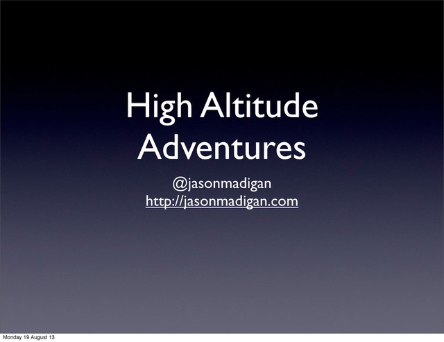 • “Odd, it’s altitude seems to be stuck at 3.7km” • GPS never regained a lock until it landed • We could hear the Payload via UHF Radio for the whole chase Monday 19 August 13