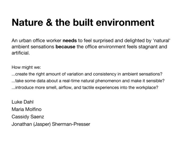 I'm sitting at the edge of being outside and inside." - Kunal, 26 - "The HVAC system is constant and monotonous. There's no ebb and flow like a natural breeze." - John, 31 - "I don't like how cluttered [indoors] can get. In nature, clutter doesn't apply. It's full of things, but it's supposed to be full of things. There's a feeling of openness." - Zoe, 28 - "I don't like what technology does to the air. It's like being in an airplane." - Denni, 55 8 Interviewees: Kunal, 26 (Stanford grad student); Rahmin, 28 (works at startup); Melissa, 29 (civil rights lawyer); John, 31 (software engineer); Steve, 65 (lawyer); Zoe, 28 (former journalist); Ernest, 50- 60 (math teacher in Japan); Denni, 55 (associate director of Native American Cultural Center on campus)