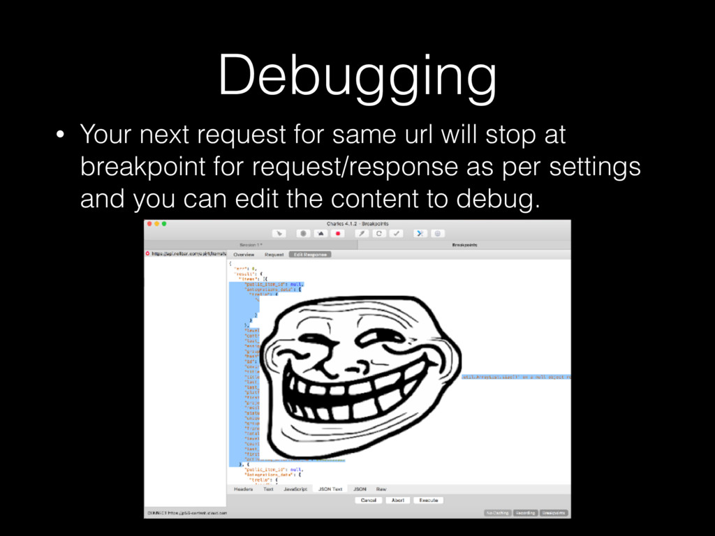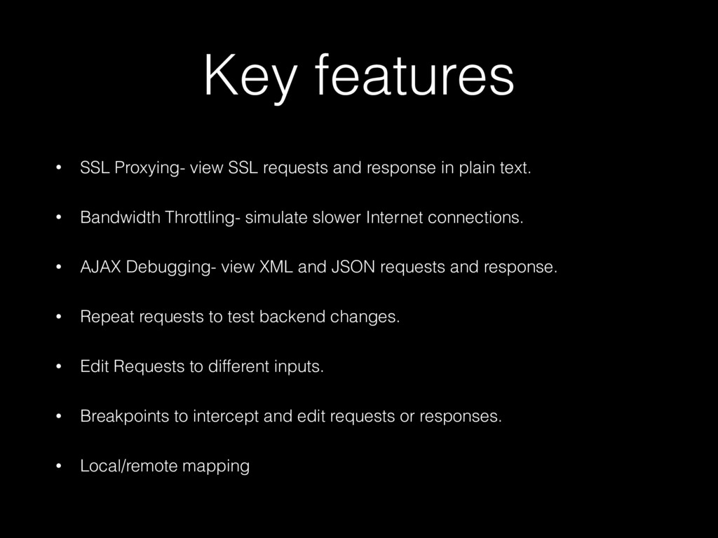 in plain text. • Bandwidth Throttling- simulate slower Internet connections. • AJAX Debugging- view XML and JSON requests and response. • Repeat requests to test backend changes. • Edit Requests to different inputs. • Breakpoints to intercept and edit requests or responses. • Local/remote mapping