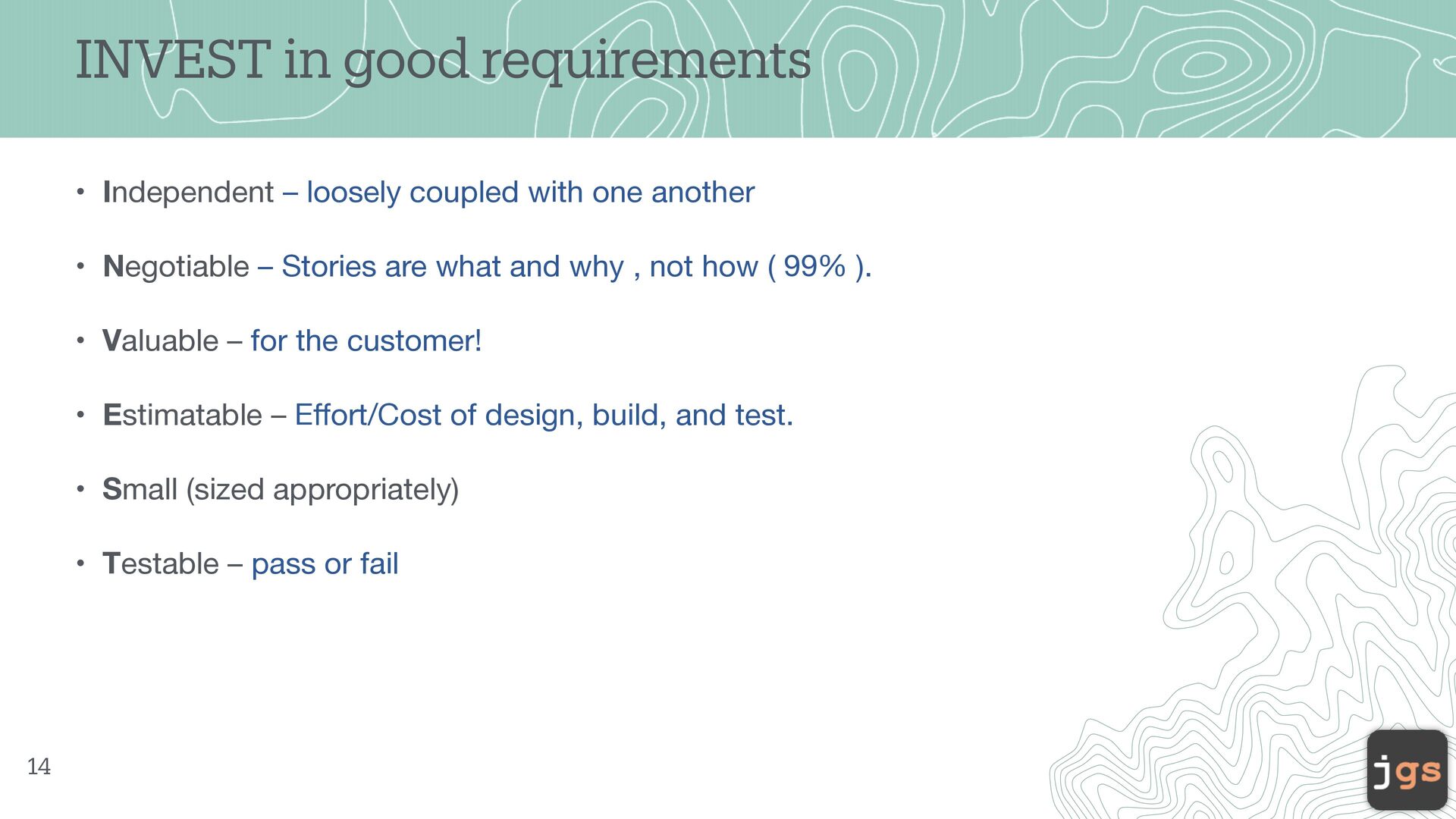 6. INVEST in good requirements • Independent – loosely coupled with