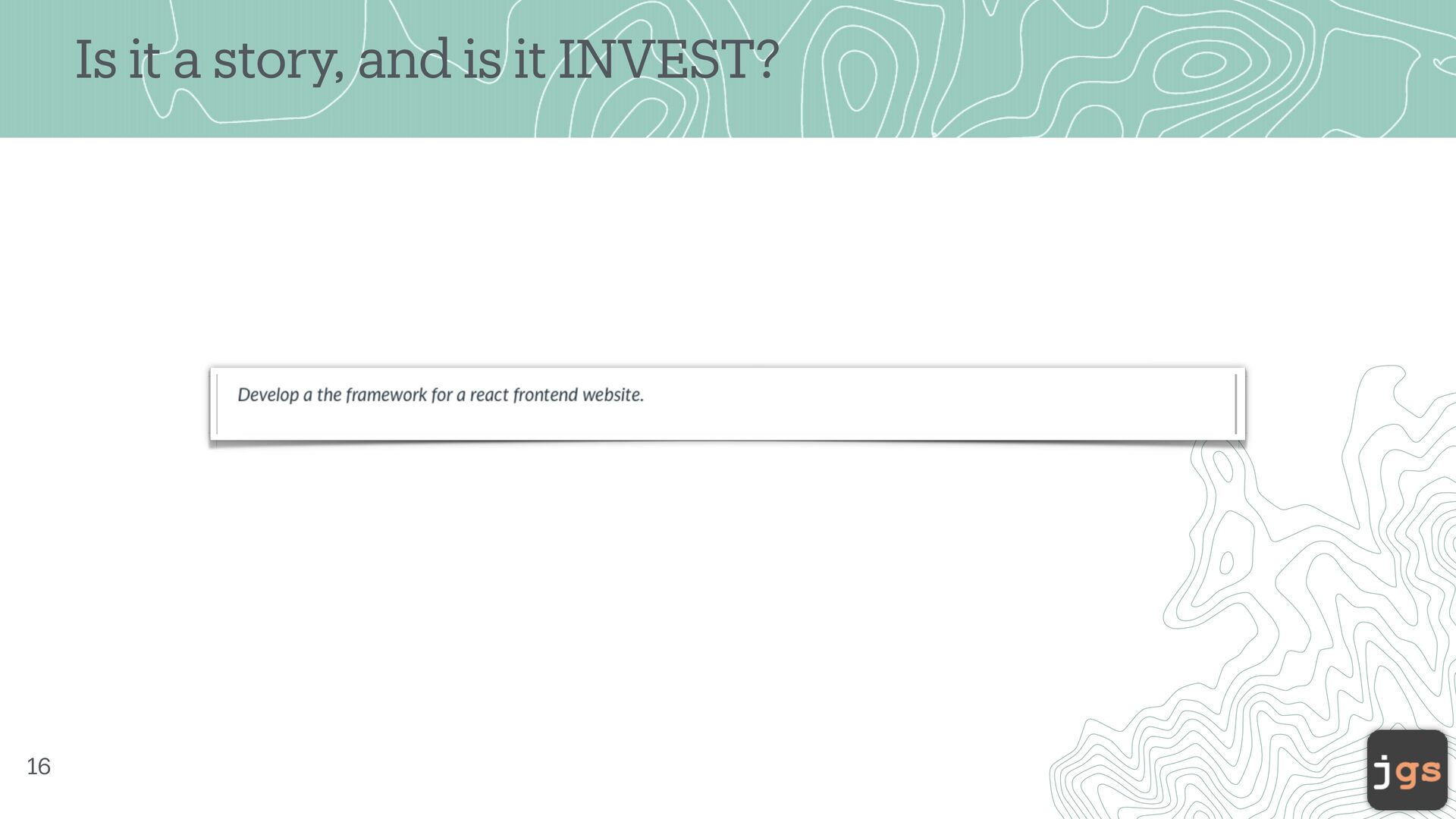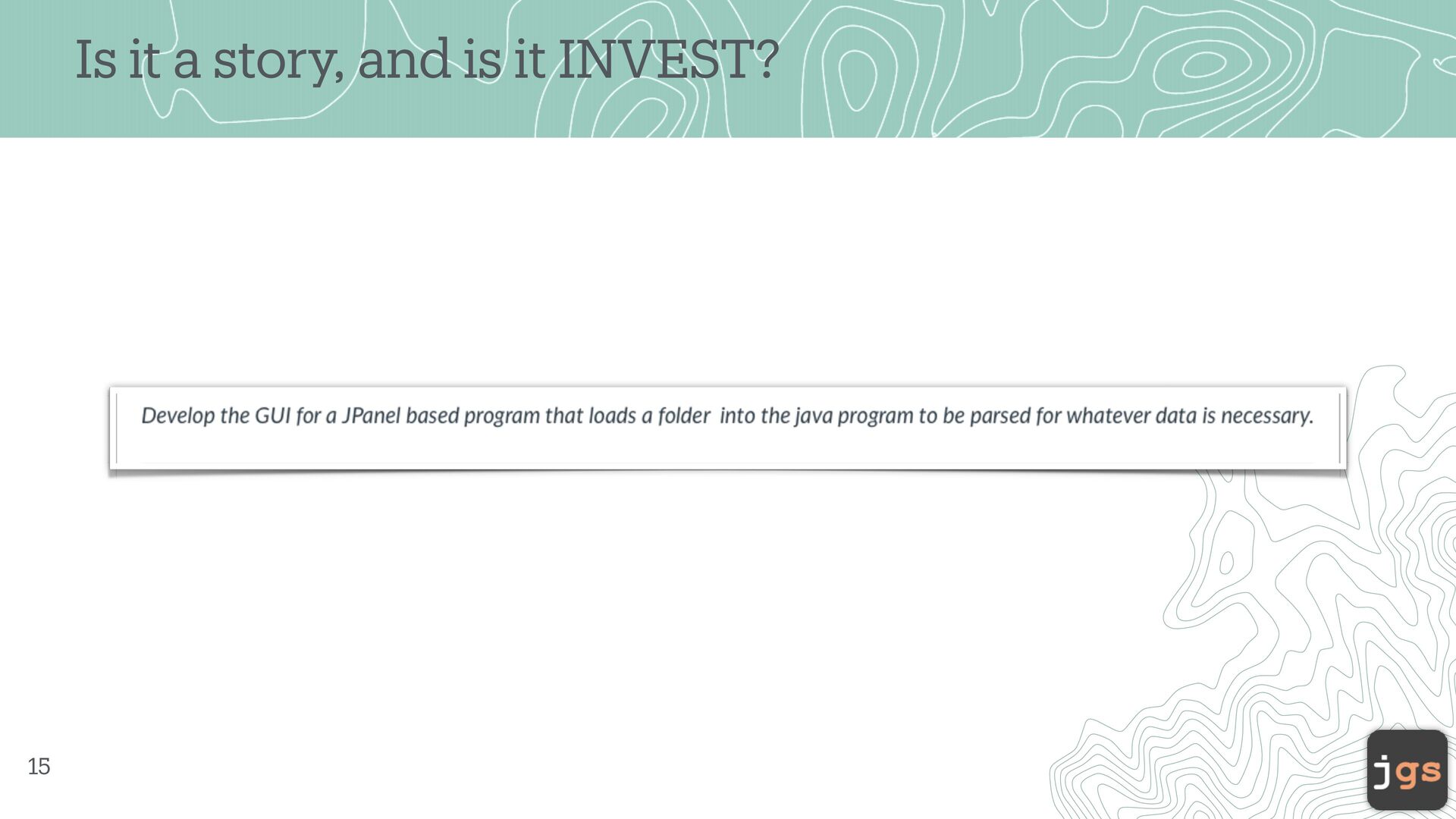 one another • Negotiable – Stories are what and why , not how ( 99% ). • Valuable – for the customer! • Estimatable – E ff ort/Cost of design, build, and test. • Small (sized appropriately) • Testable – pass or fail 14