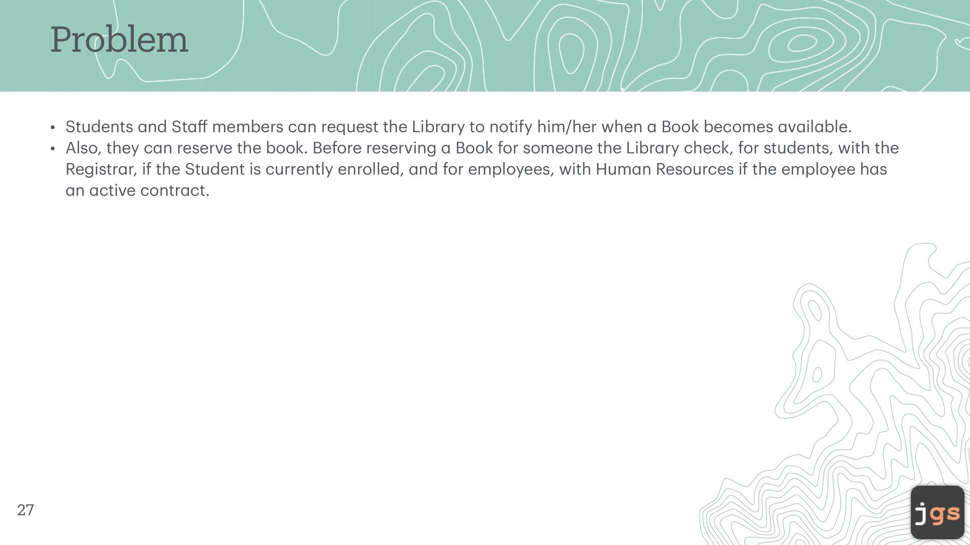 n request the Libr a ry to notify him/her when a Book becomes a v a il a ble. • Also, they c a n reserve the book. Before reserving a Book for someone the Libr a ry check, for students, with the Registr a r, if the Student is currently enrolled, a nd for employees, with Hum a n Resources if the employee h a s a n a ctive contr a ct. 27