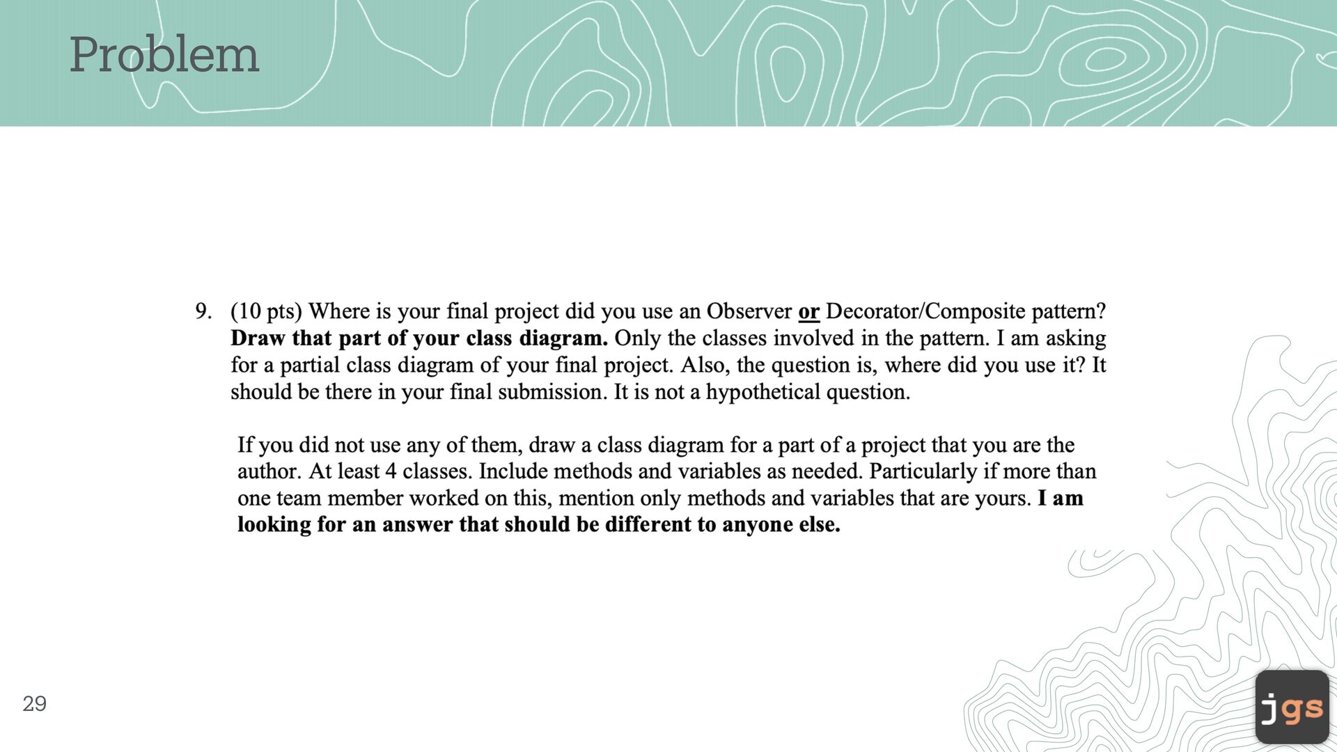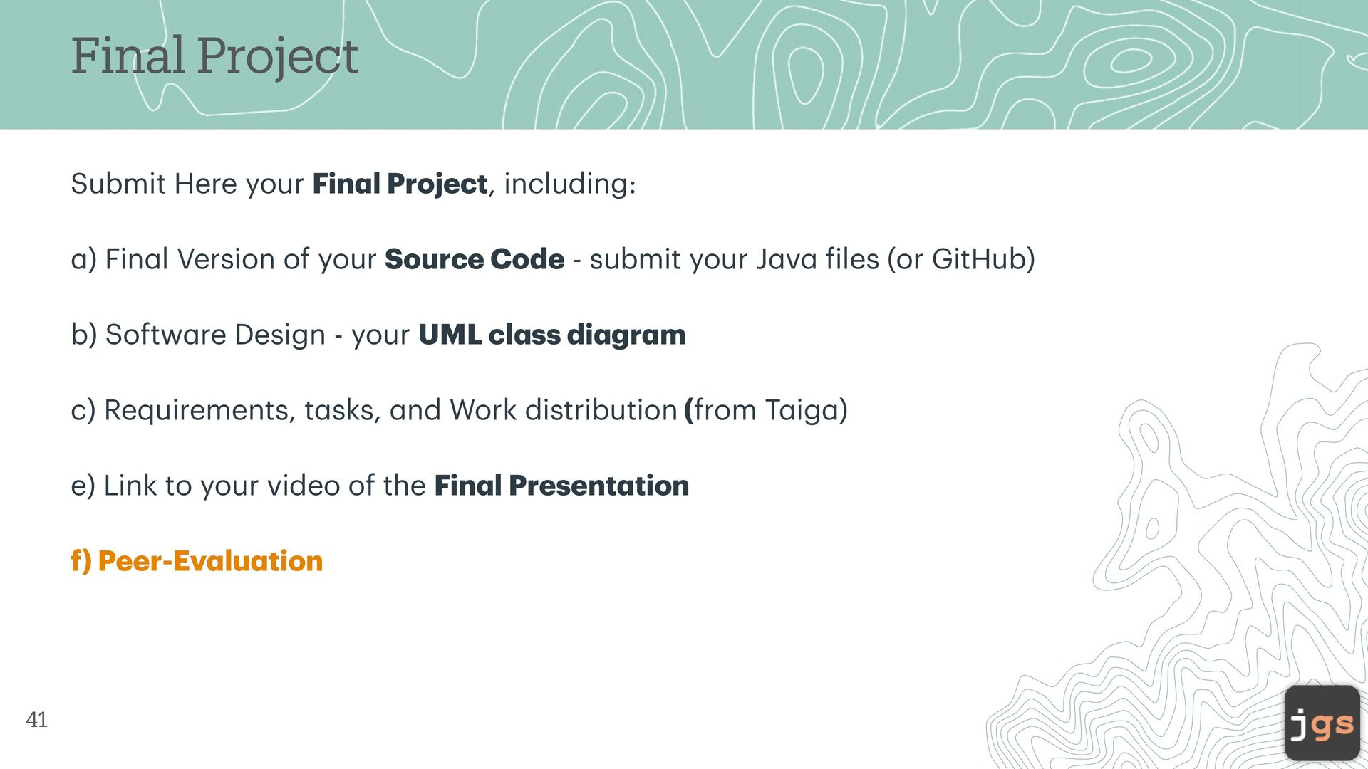 a ) Fin a l Version of your Source Code - submit your J a v a f iles (or GitHub) b) Softw a re Design - your UML cl a ss di a gr a m c) Requirements, t a sks, a nd Work distribution (from T a ig a ) e) Link to your video of the Fin a l Present a tion f) Peer-Ev a lu a tion 41