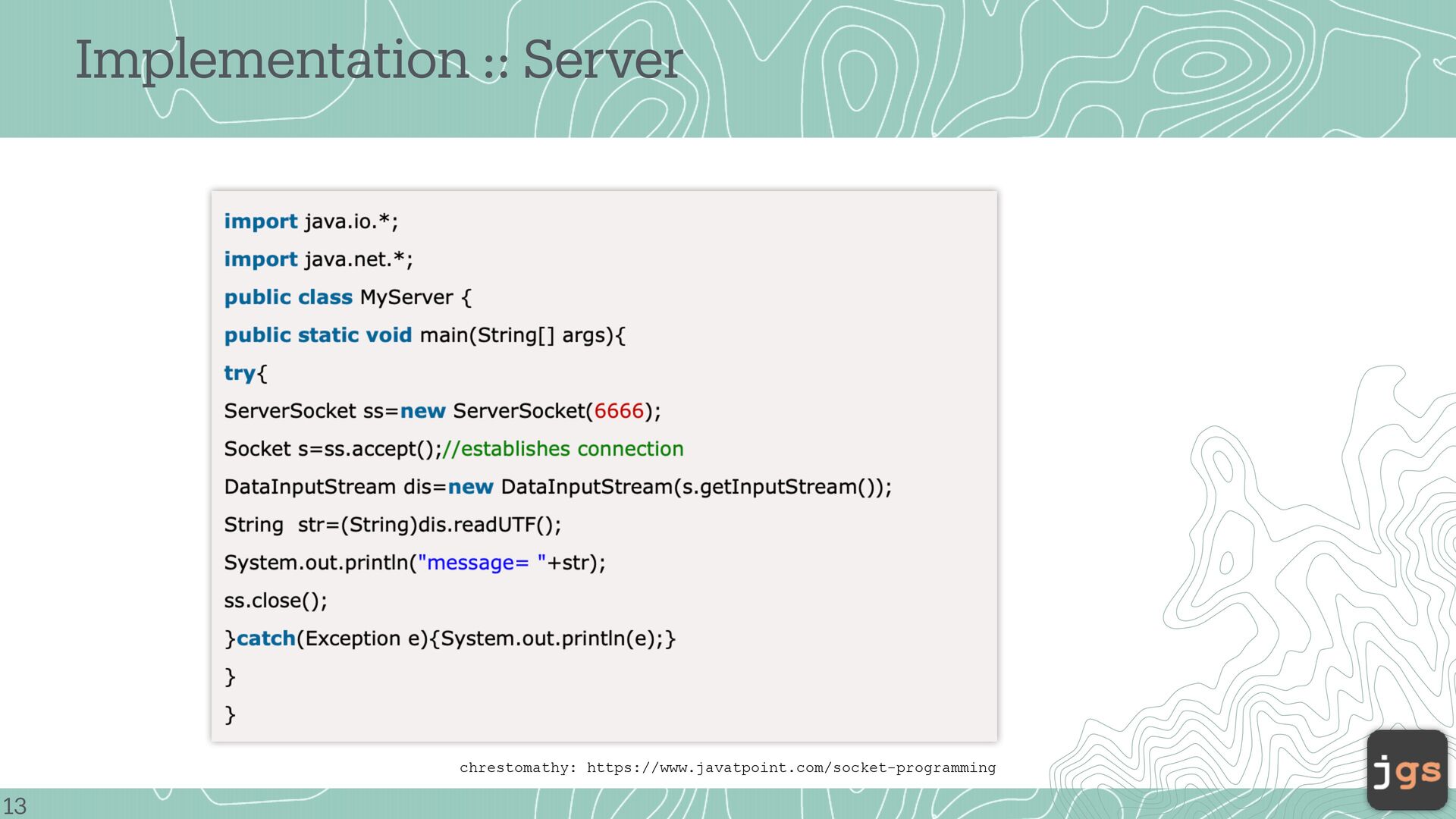 Implementation :: Server 13 chrestomathy: https://www.javatpoint.com/socket-programming