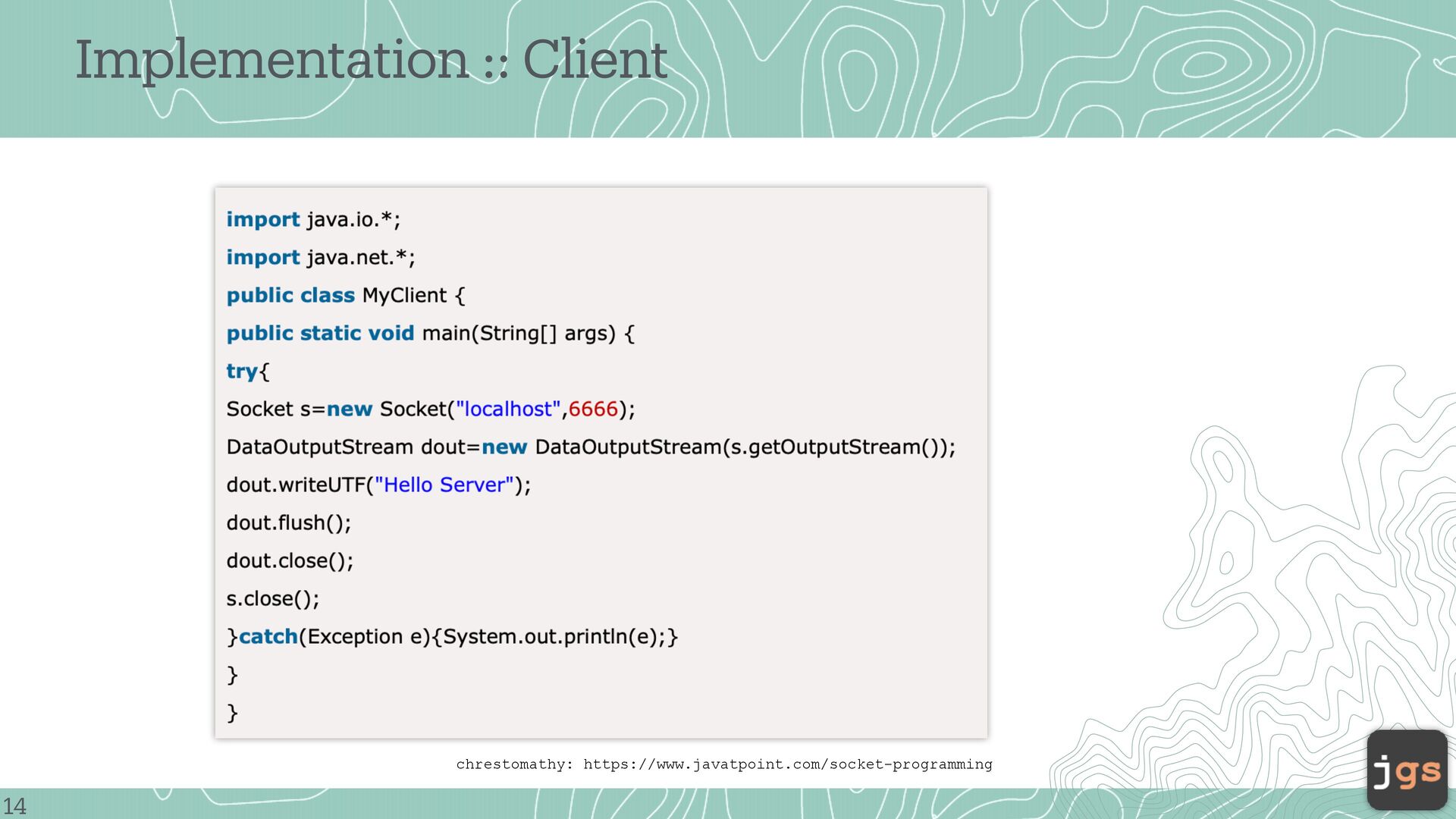 Implementation :: Client 14 chrestomathy: https://www.javatpoint.com/socket-programming