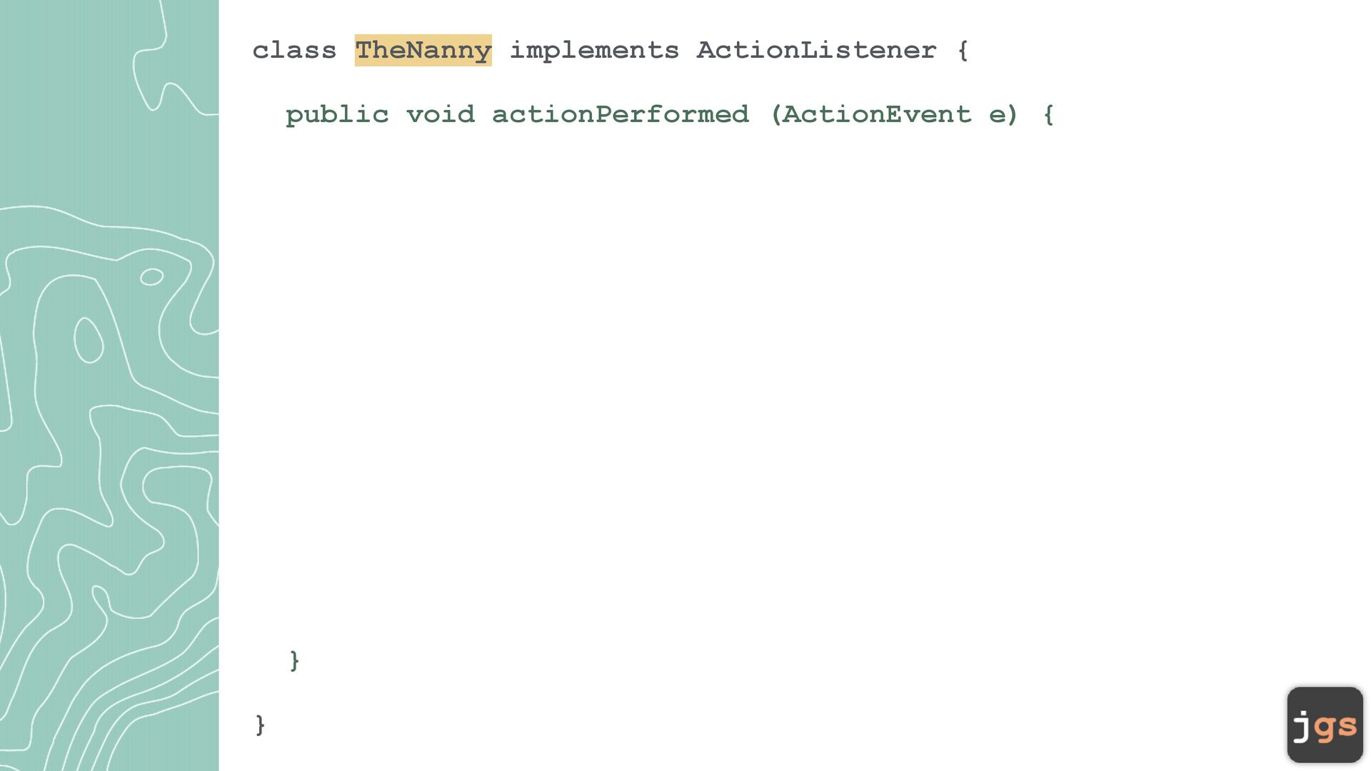 class TheNanny implements ActionListener { public void actionPerformed (ActionEvent e)