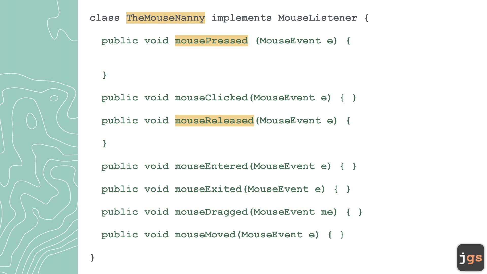 class TheMouseNanny implements MouseListener { public void mousePressed (MouseEvent e)