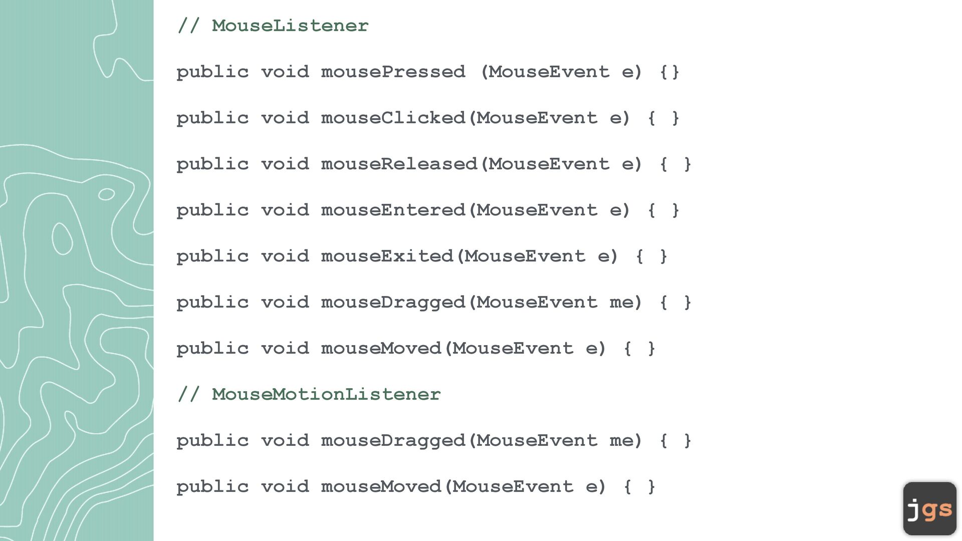// MouseListener public void mousePressed (MouseEvent e) {} public void