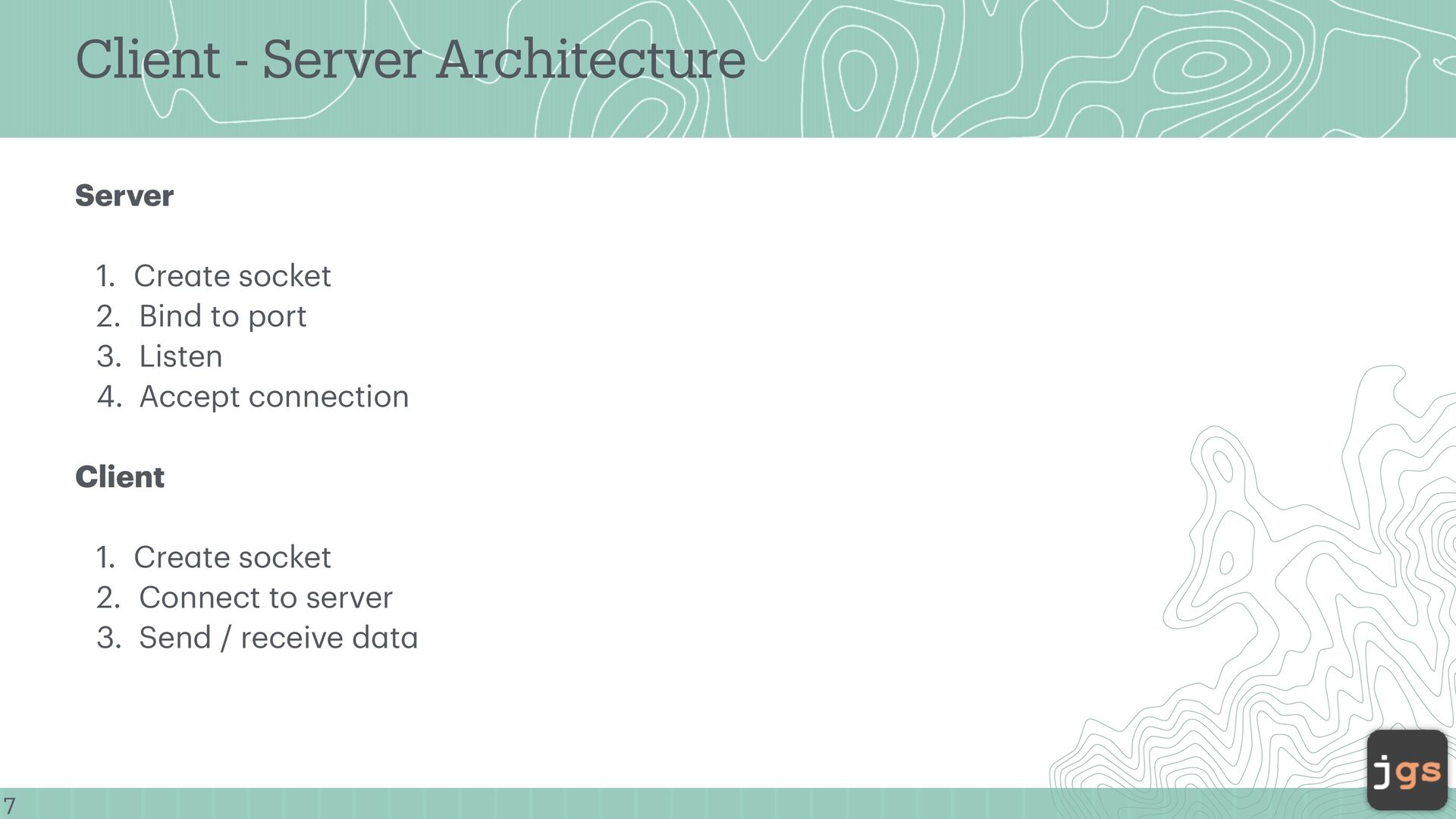 socket 2. Bind to port 3. Listen 4. Accept connection Client 1. Cre a te socket 2. Connect to server 3. Send / receive d a t a