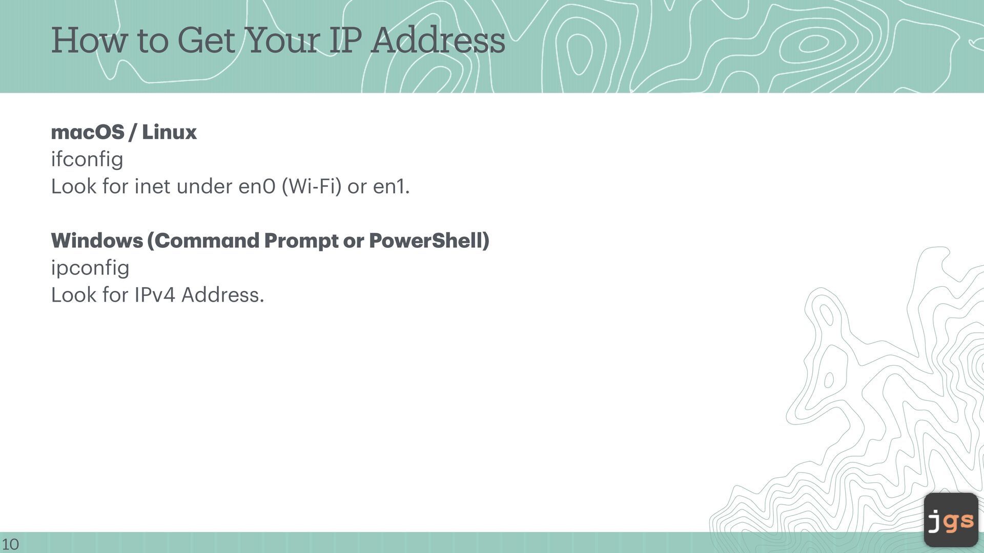 / Linux ifcon f ig Look for inet under en0 (Wi-Fi) or en1. Windows (Comm a nd Prompt or PowerShell) ipcon f ig Look for IPv4 Address.