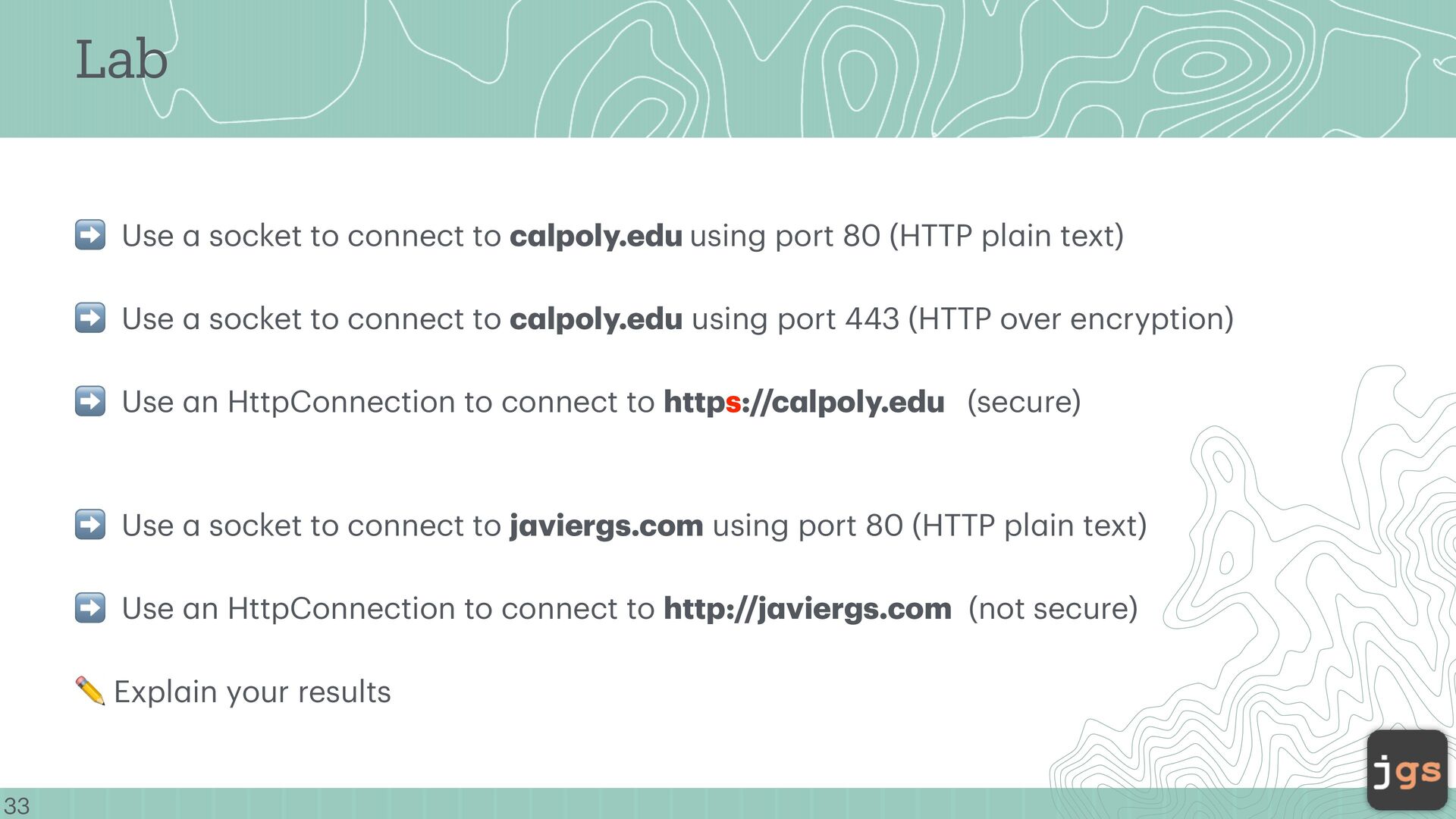 out.write("GET / HTTP/1.1\r\nHost: ...".getBytes()); To this: URL url = new URL("http://example.com"); HttpURLConnection con =(HttpURLConnection) url.openConnection(); ➡ Good softw a re hides protocol complexity behind objects