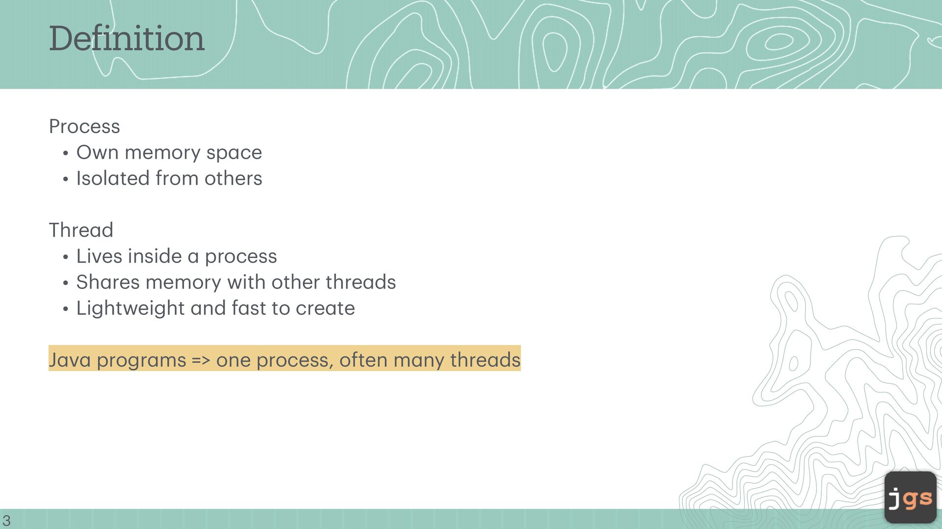 ce • Isol a ted from others Thre a d • Lives inside a process • Sh a res memory with other thre a ds • Lightweight a nd f a st to cre a te J a v a progr a ms => one process, often m a ny thre a ds