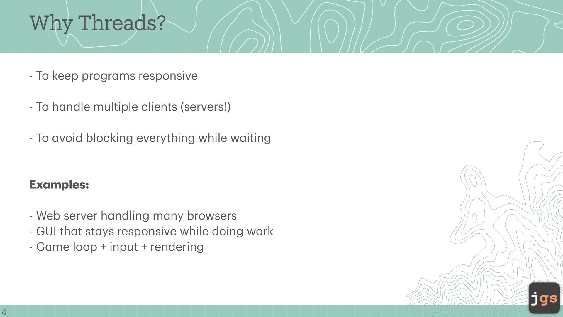 - To h a ndle multiple clients (servers!) - To a void blocking everything while w a iting Ex a mples: - Web server h a ndling m a ny browsers - GUI th a t st a ys responsive while doing work - G a me loop + input + rendering