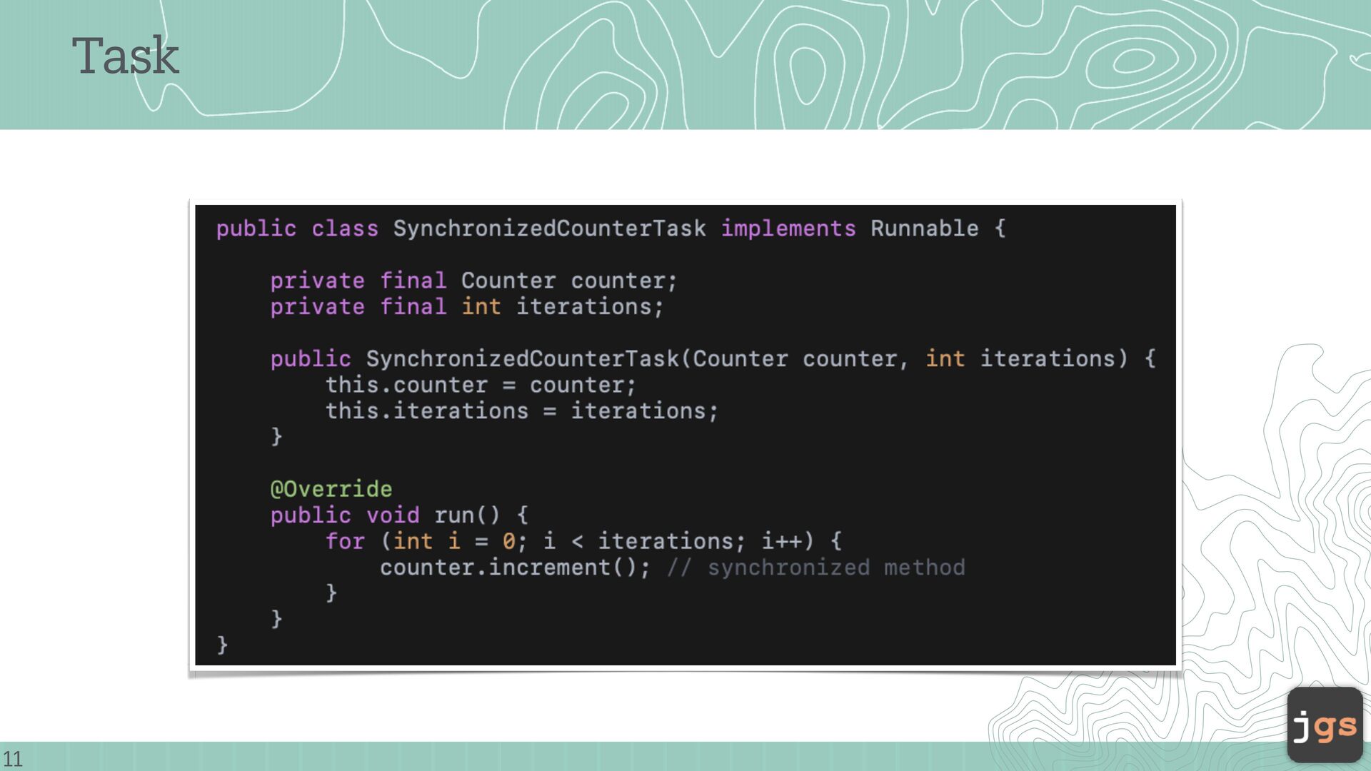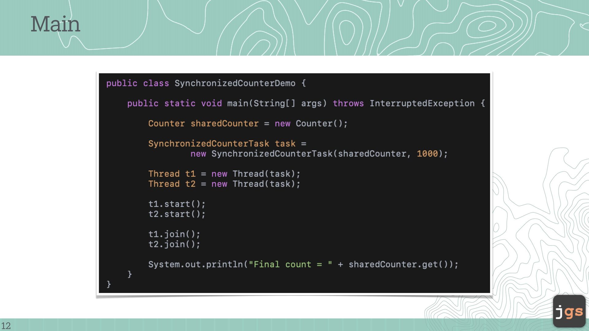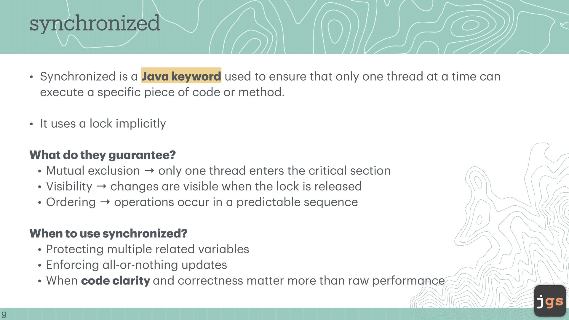 keyword used to ensure th a t only one thre a d a t a time c a n execute a speci f ic piece of code or method. • It uses a lock implicitly Wh a t do they gu a r a ntee? • Mutu a l exclusion → only one thre a d enters the critic a l section • Visibility → ch a nges a re visible when the lock is rele a sed • Ordering → oper a tions occur in a predict a ble sequence When to use synchronized? • Protecting multiple rel a ted v a ri a bles • Enforcing a ll-or-nothing upd a tes • When code cl a rity a nd correctness m a tter more th a n r a w perform a nce