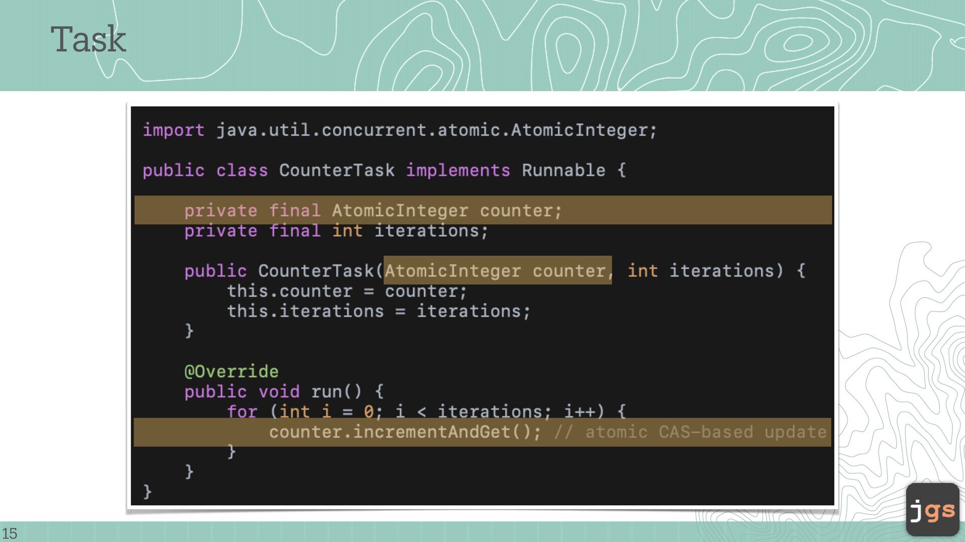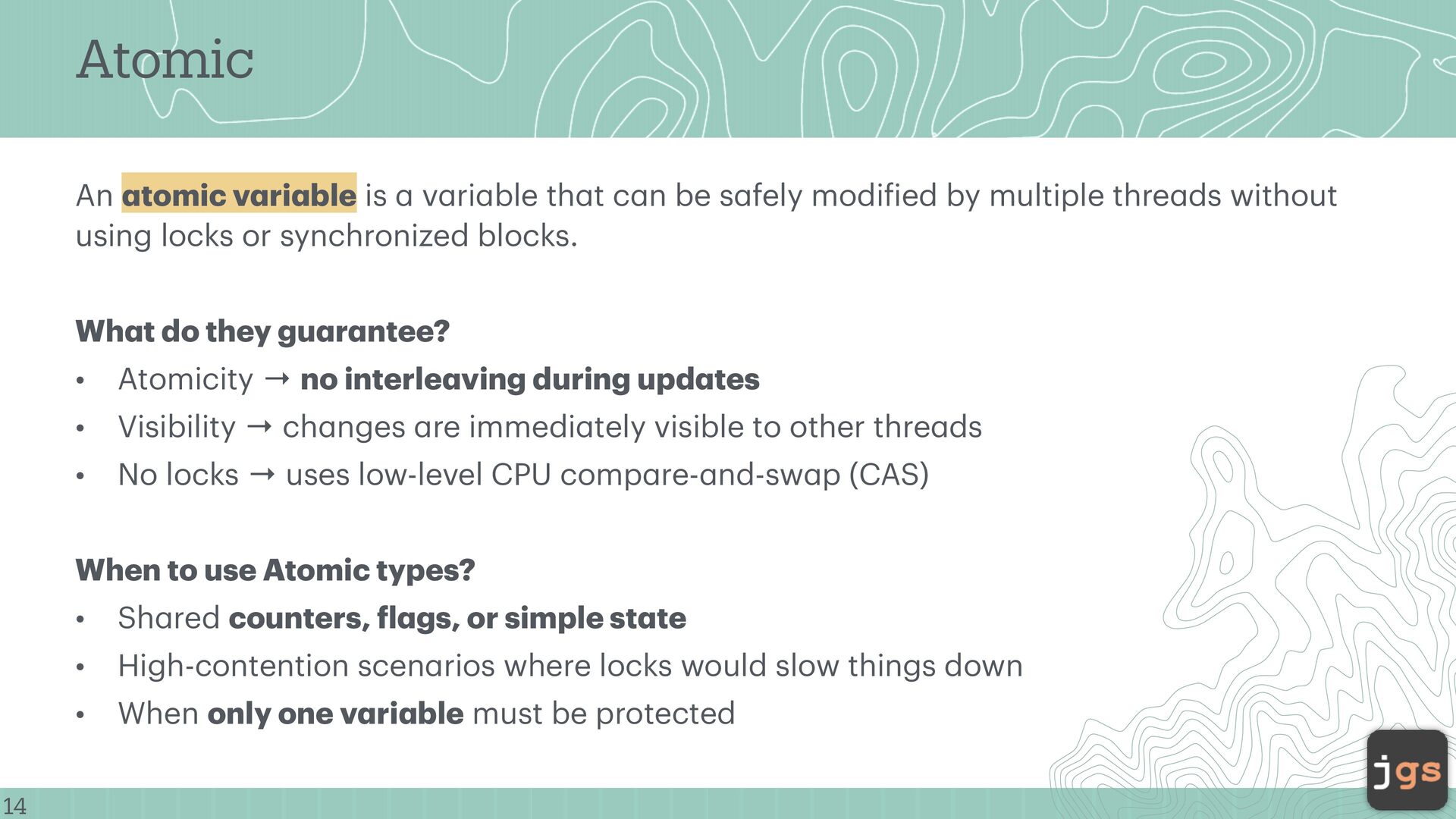 is a v a ri a ble th a t c a n be s a fely modi f ied by multiple thre a ds without using locks or synchronized blocks. Wh a t do they gu a r a ntee? • Atomicity → no interle a ving during upd a tes • Visibility → ch a nges a re immedi a tely visible to other thre a ds • No locks → uses low-level CPU comp a re- a nd-sw a p (CAS) When to use Atomic types? • Sh a red counters, f l a gs, or simple st a te • High-contention scen a rios where locks would slow things down • When only one v a ri a ble must be protected