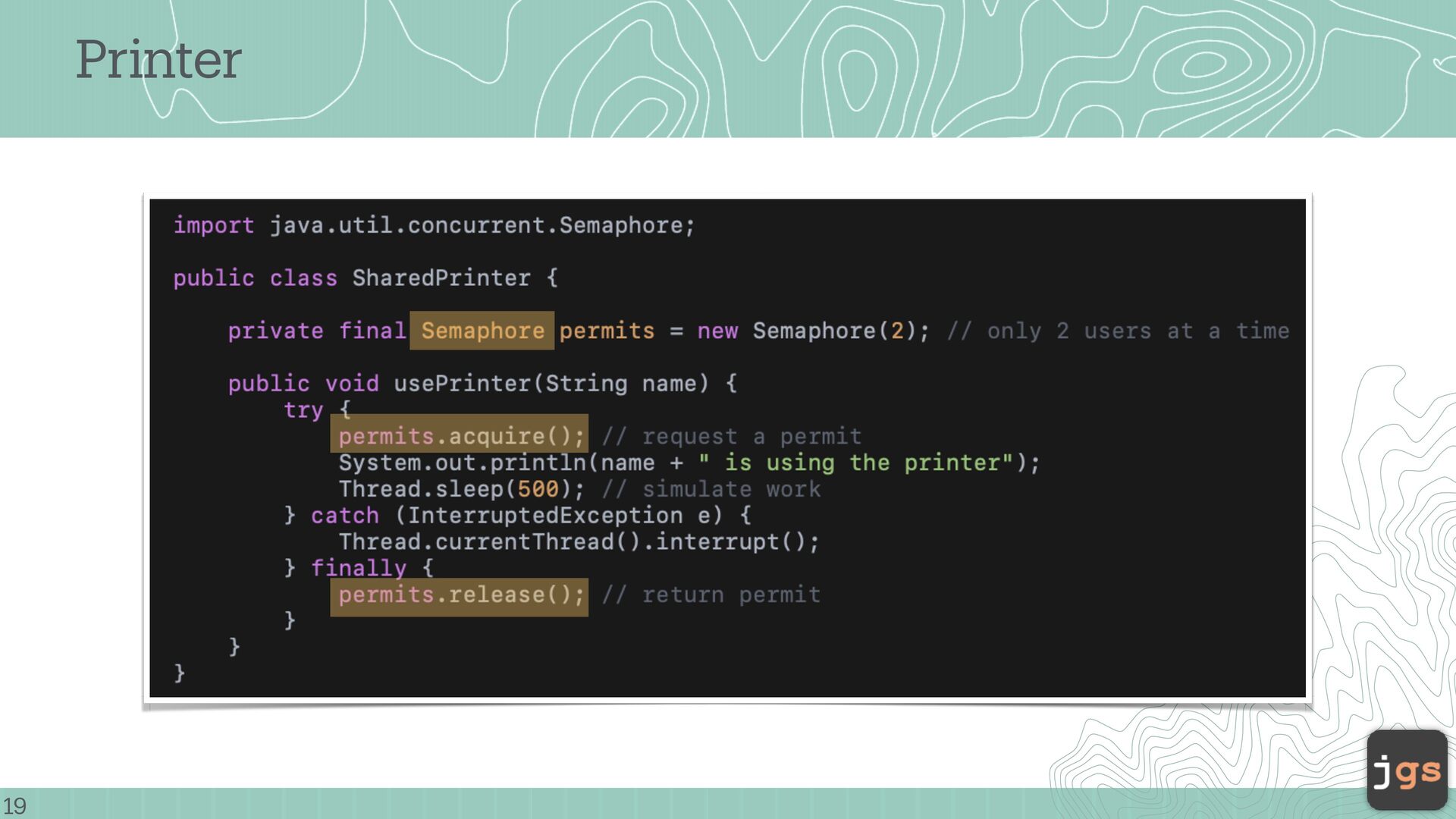 tion mech a nism th a t controls a ccess to a resource by m a int a ining a f ixed number of permits. Thre a ds must a cquire a permit before proceeding a nd rele a se it when f inished. Wh a t do they gu a r a ntee? • Bounded a ccess → only a limited number of thre a ds m a y enter • Visibility → ch a nges a re visible when permits a re rele a sed • No ownership → permits a re not tied to a speci f ic thre a d When to use Sem a phores? • Limiting a ccess to a f inite resource (connections, printers, c a rts) • Throttling concurrency to a void overlo a d