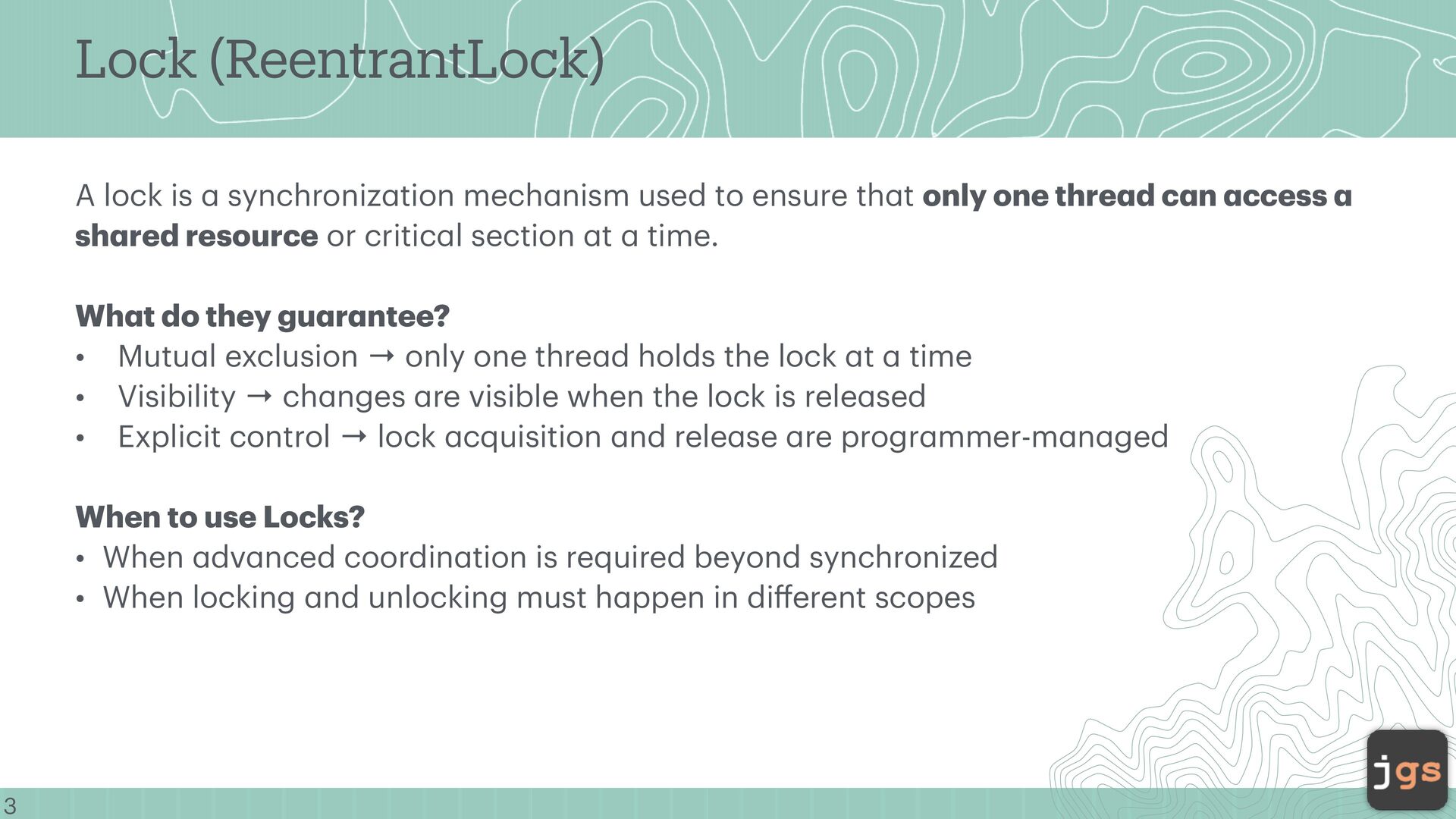 mech a nism used to ensure th a t only one thre a d c a n a ccess a sh a red resource or critic a l section a t a time. Wh a t do they gu a r a ntee? • Mutu a l exclusion → only one thre a d holds the lock a t a time • Visibility → ch a nges a re visible when the lock is rele a sed • Explicit control → lock a cquisition a nd rele a se a re progr a mmer-m a n a ged When to use Locks? • When a dv a nced coordin a tion is required beyond synchronized • When locking a nd unlocking must h a ppen in di ff erent scopes
