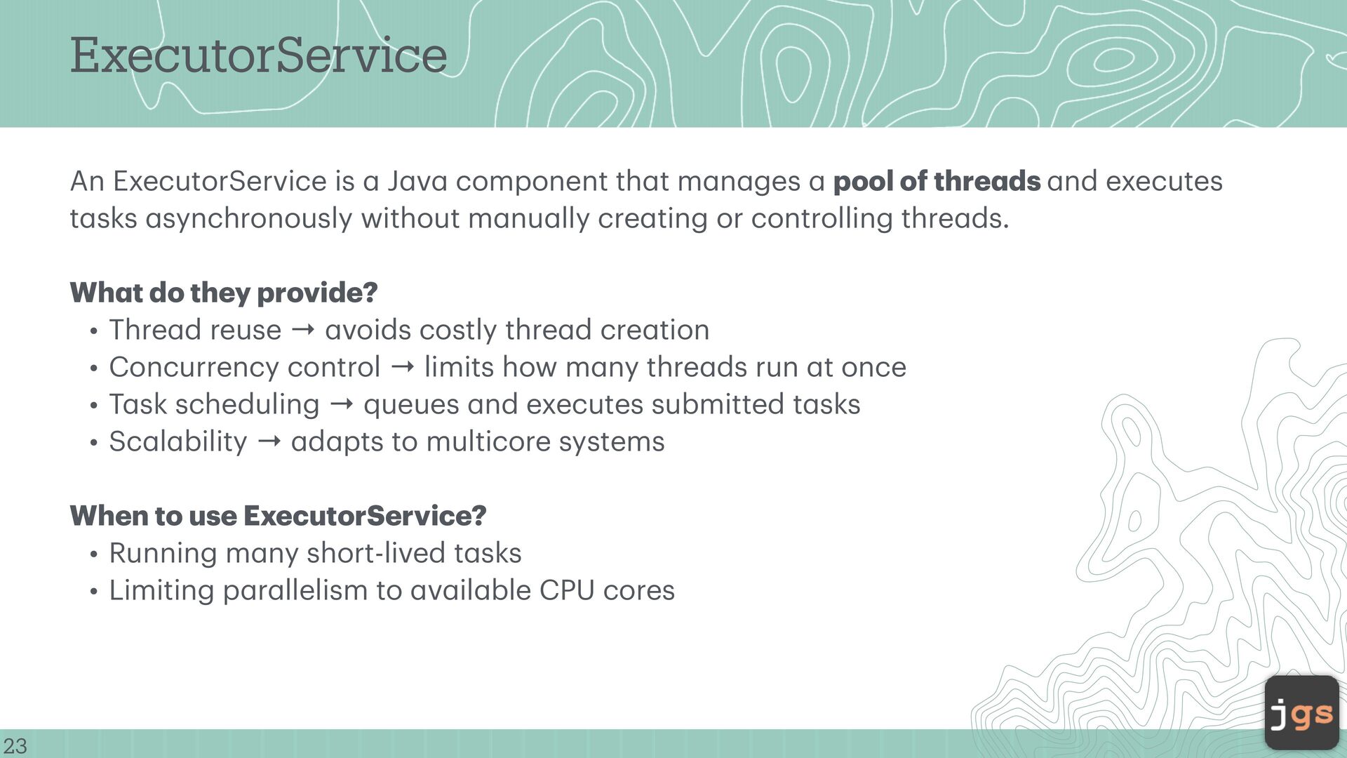 component th a t m a n a ges a pool of thre a ds a nd executes t a sks a synchronously without m a nu a lly cre a ting or controlling thre a ds. Wh a t do they provide? • Thre a d reuse → a voids costly thre a d cre a tion • Concurrency control → limits how m a ny thre a ds run a t once • T a sk scheduling → queues a nd executes submitted t a sks • Sc a l a bility → a d a pts to multicore systems When to use ExecutorService? • Running m a ny short-lived t a sks • Limiting p a r a llelism to a v a il a ble CPU cores