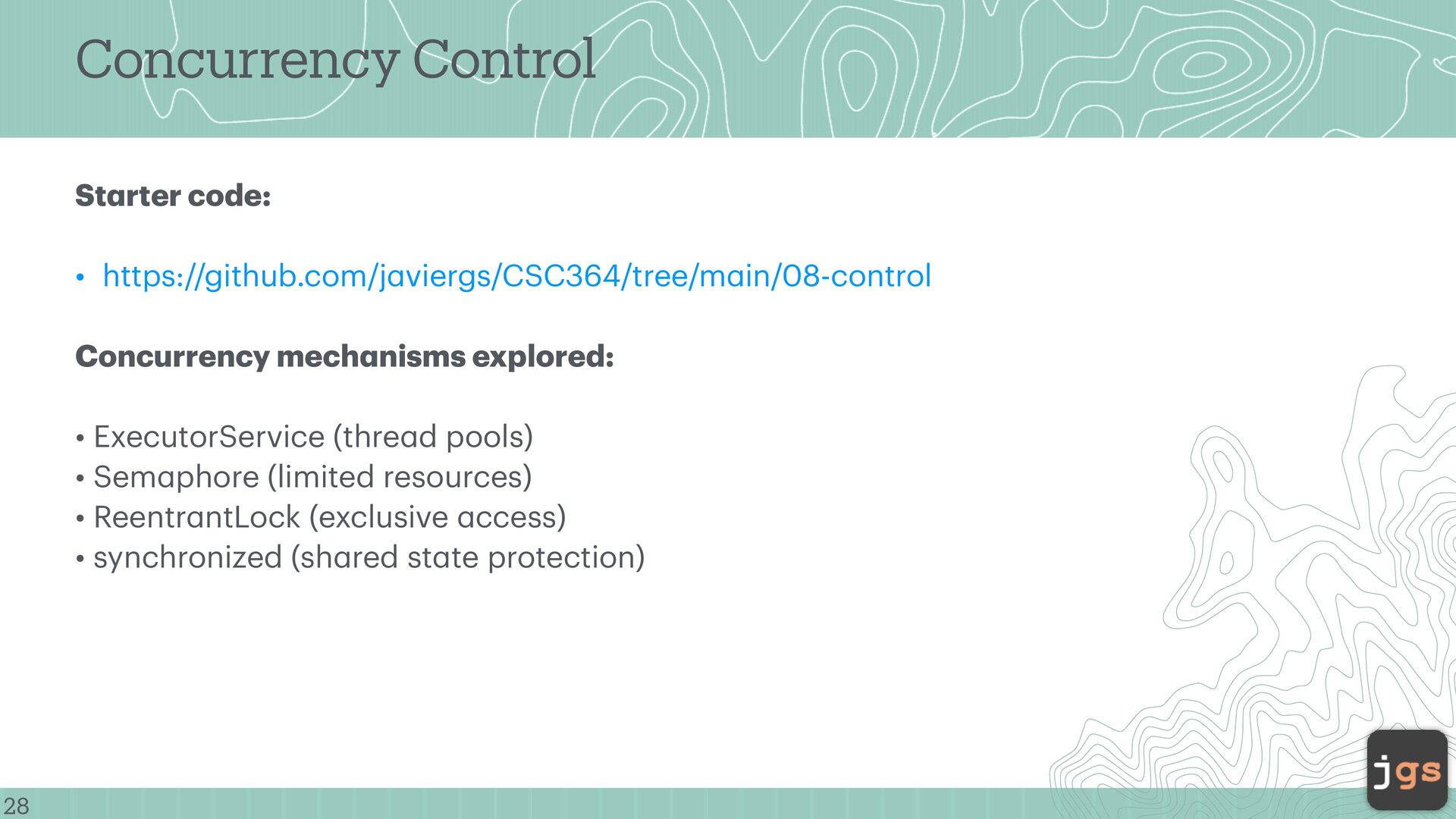 viergs/CSC364/tree/m a in/08-control Concurrency mech a nisms explored: • ExecutorService (thre a d pools) • Sem a phore (limited resources) • Reentr a ntLock (exclusive a ccess) • synchronized (sh a red st a te protection)