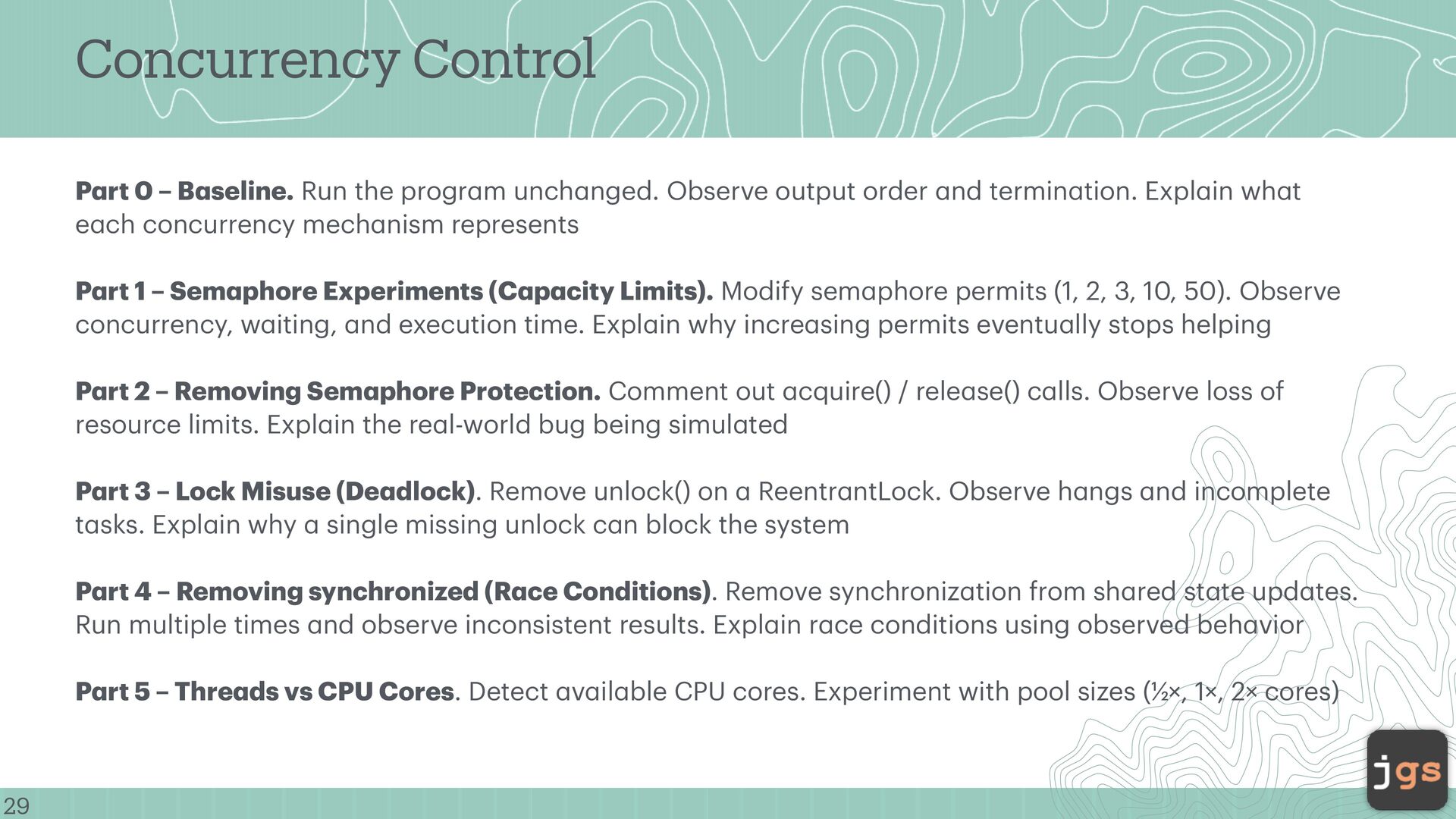 seline. Run the progr a m unch a nged. Observe output order a nd termin a tion. Expl a in wh a t e a ch concurrency mech a nism represents P a rt 1 – Sem a phore Experiments (C a p a city Limits). Modify sem a phore permits (1, 2, 3, 10, 50). Observe concurrency, w a iting, a nd execution time. Expl a in why incre a sing permits eventu a lly stops helping P a rt 2 – Removing Sem a phore Protection. Comment out a cquire() / rele a se() c a lls. Observe loss of resource limits. Expl a in the re a l-world bug being simul a ted P a rt 3 – Lock Misuse (De a dlock). Remove unlock() on a Reentr a ntLock. Observe h a ngs a nd incomplete t a sks. Expl a in why a single missing unlock c a n block the system P a rt 4 – Removing synchronized (R a ce Conditions). Remove synchroniz a tion from sh a red st a te upd a tes. Run multiple times a nd observe inconsistent results. Expl a in r a ce conditions using observed beh a vior P a rt 5 – Thre a ds vs CPU Cores. Detect a v a il a ble CPU cores. Experiment with pool sizes (½×, 1×, 2× cores)