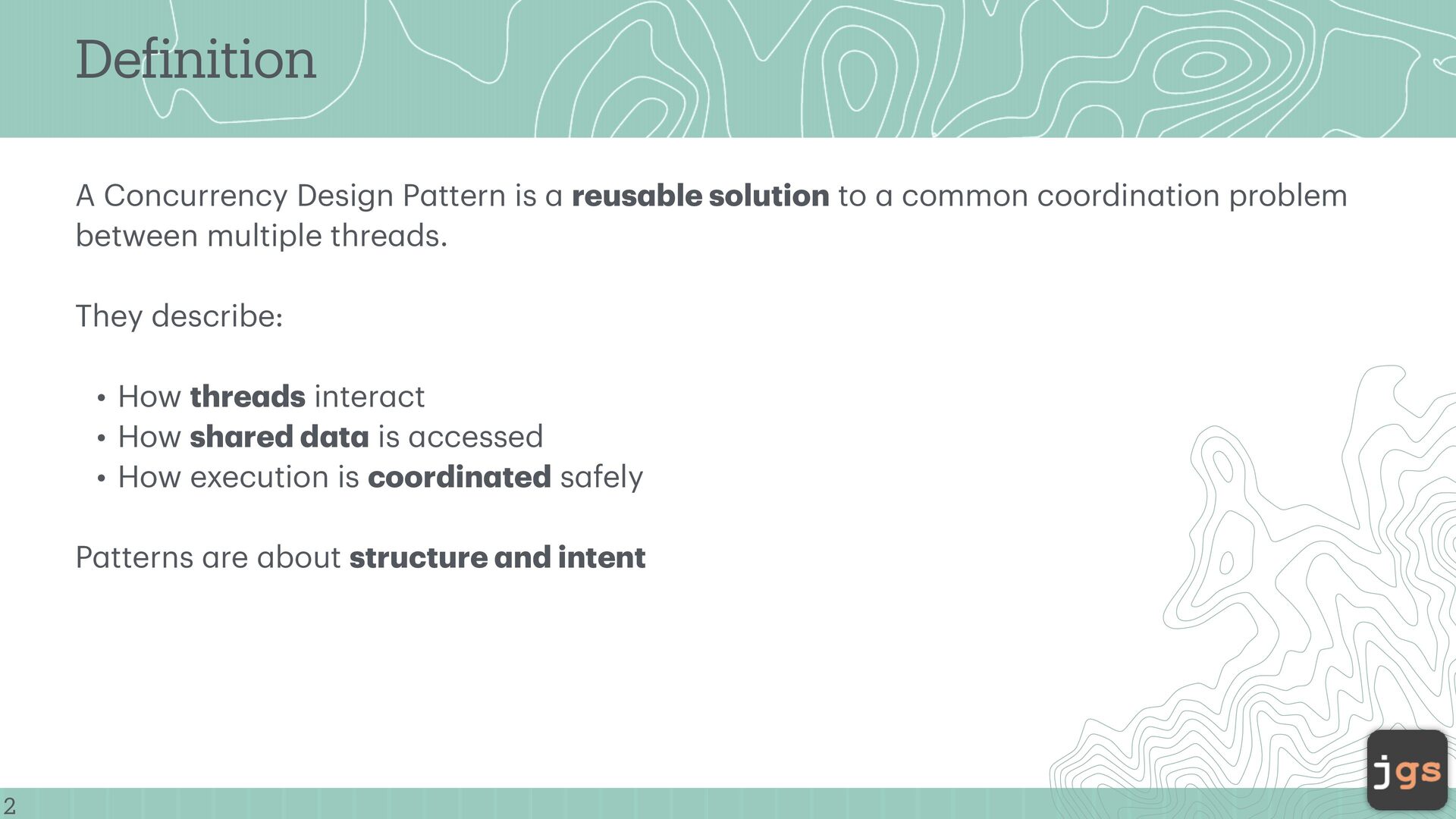 is a reus a ble solution to a common coordin a tion problem between multiple thre a ds. They describe: • How thre a ds inter a ct • How sh a red d a t a is a ccessed • How execution is coordin a ted s a fely P a tterns a re a bout structure a nd intent