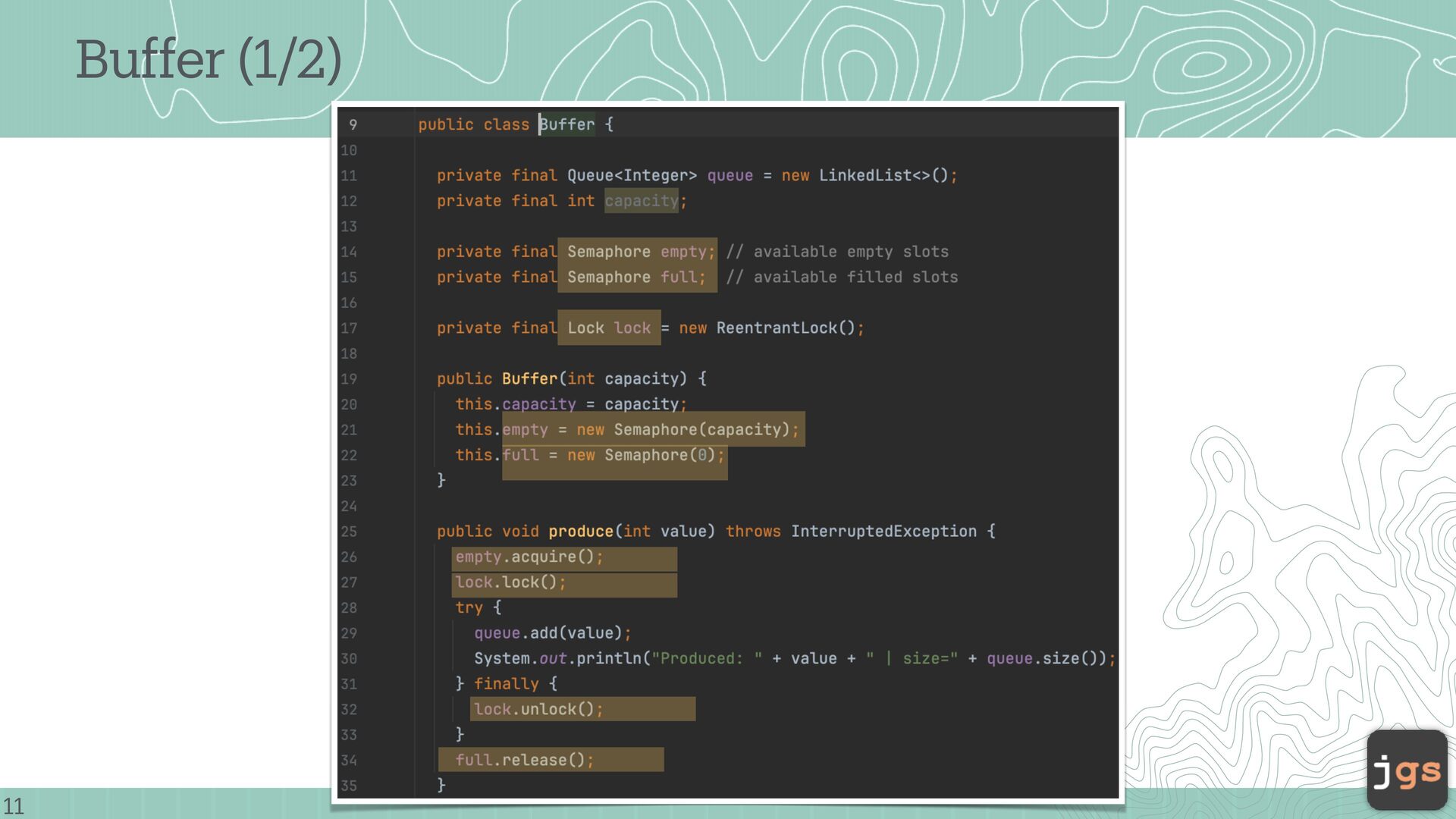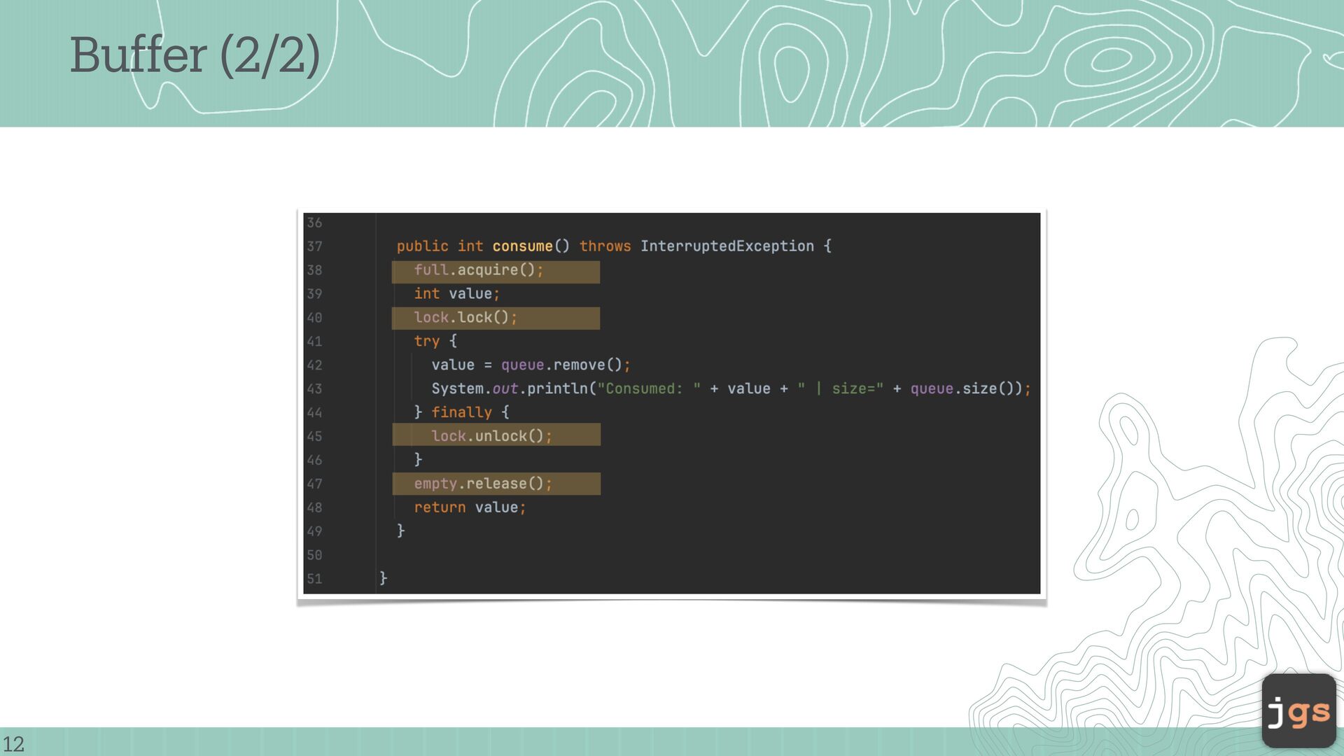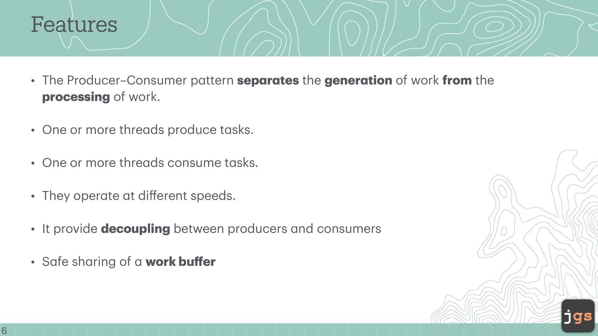 r a tes the gener a tion of work from the processing of work. • One or more thre a ds produce t a sks. • One or more thre a ds consume t a sks. • They oper a te a t di ff erent speeds. • It provide decoupling between producers a nd consumers • S a fe sh a ring of a work bu ff er