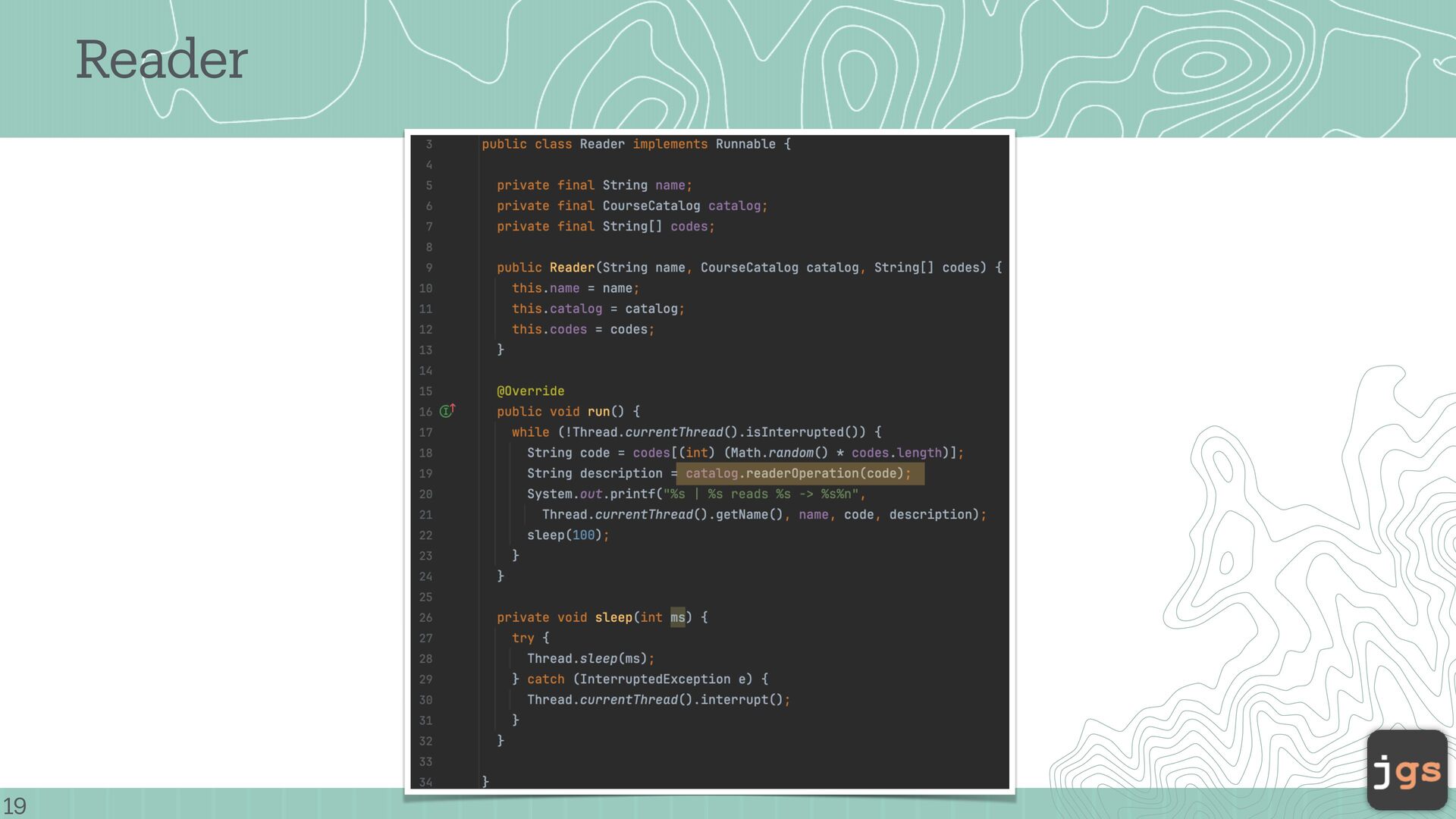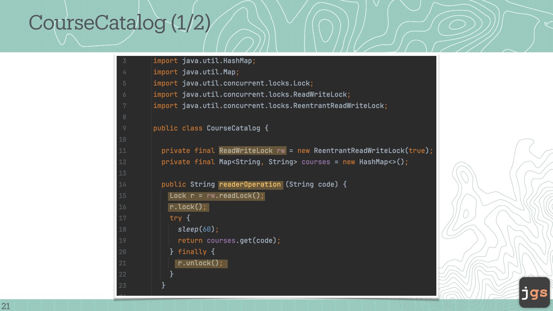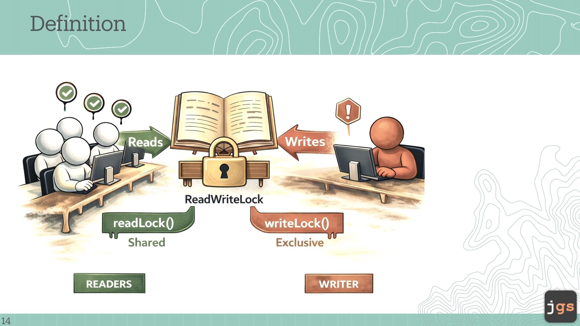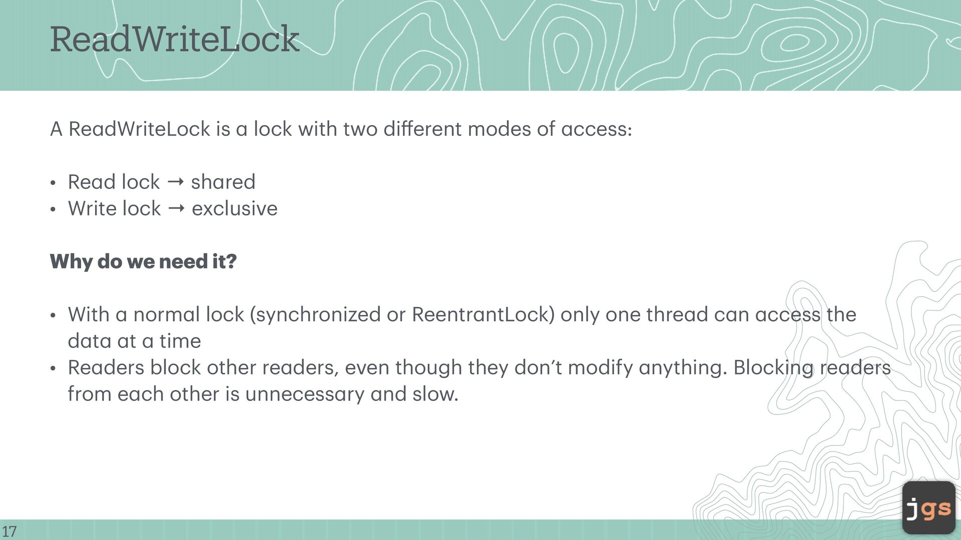 two di ff erent modes of a ccess: • Re a d lock → sh a red • Write lock → exclusive Why do we need it? • With a norm a l lock (synchronized or Reentr a ntLock) only one thre a d c a n a ccess the d a t a a t a time • Re a ders block other re a ders, even though they don’t modify a nything. Blocking re a ders from e a ch other is unnecess a ry a nd slow.