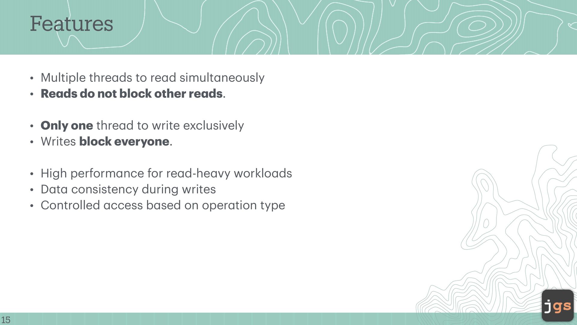 d simult a neously • Re a ds do not block other re a ds. • Only one thre a d to write exclusively • Writes block everyone. • High perform a nce for re a d-he a vy worklo a ds • D a t a consistency during writes • Controlled a ccess b a sed on oper a tion type