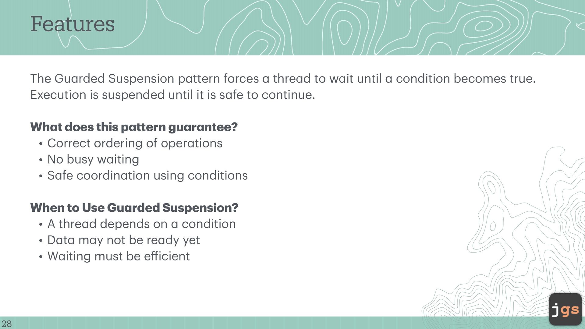 forces a thre a d to w a it until a condition becomes true. Execution is suspended until it is s a fe to continue. Wh a t does this p a ttern gu a r a ntee? • Correct ordering of oper a tions • No busy w a iting • S a fe coordin a tion using conditions When to Use Gu a rded Suspension? • A thre a d depends on a condition • D a t a m a y not be re a dy yet • W a iting must be e ff icient