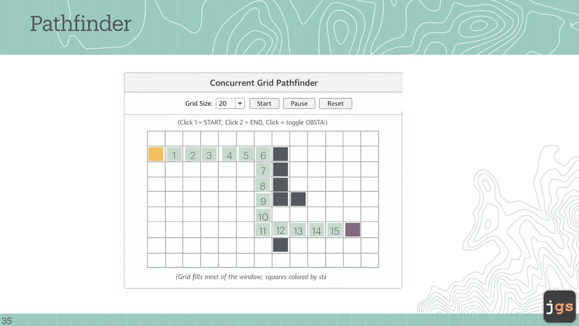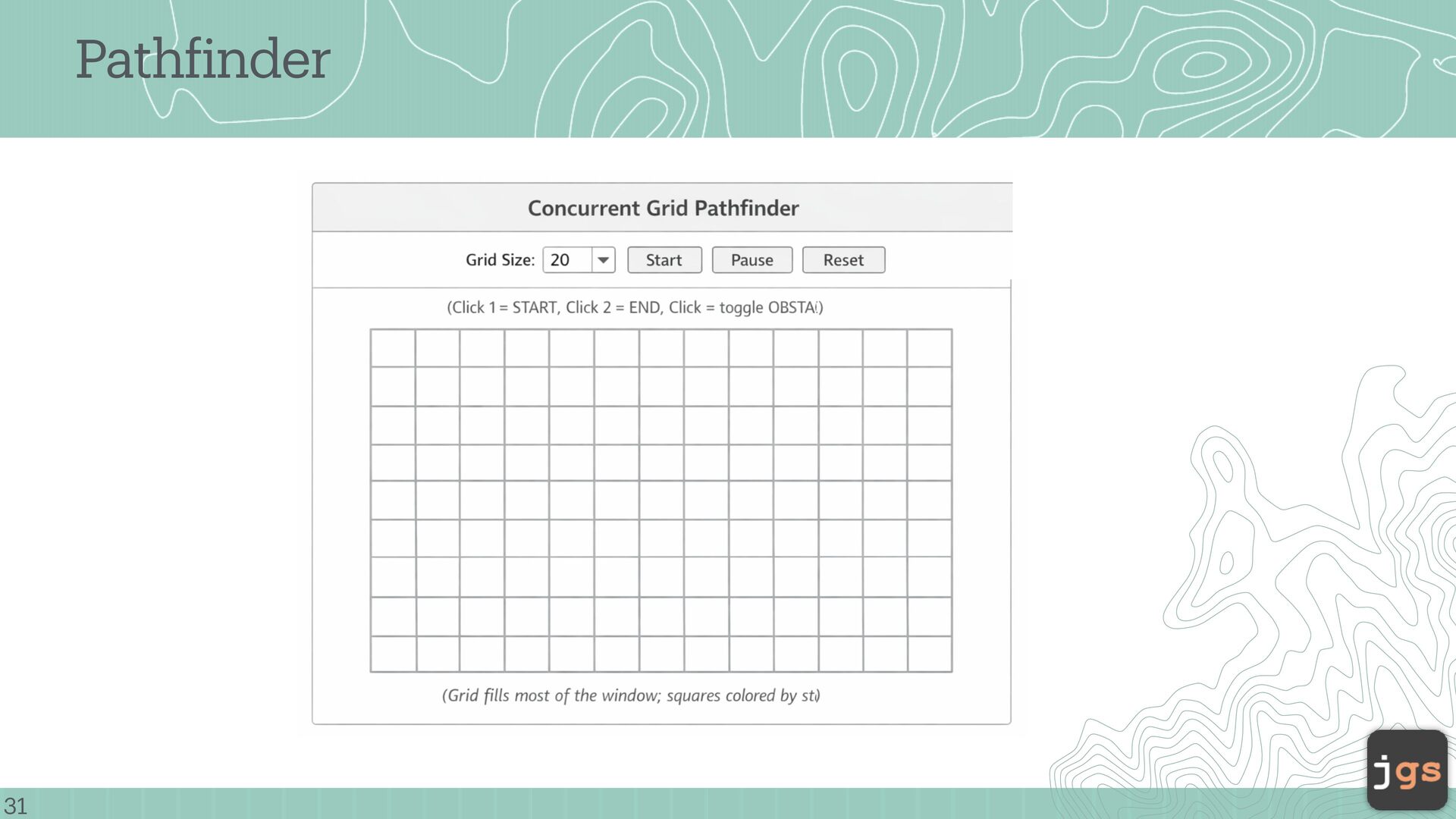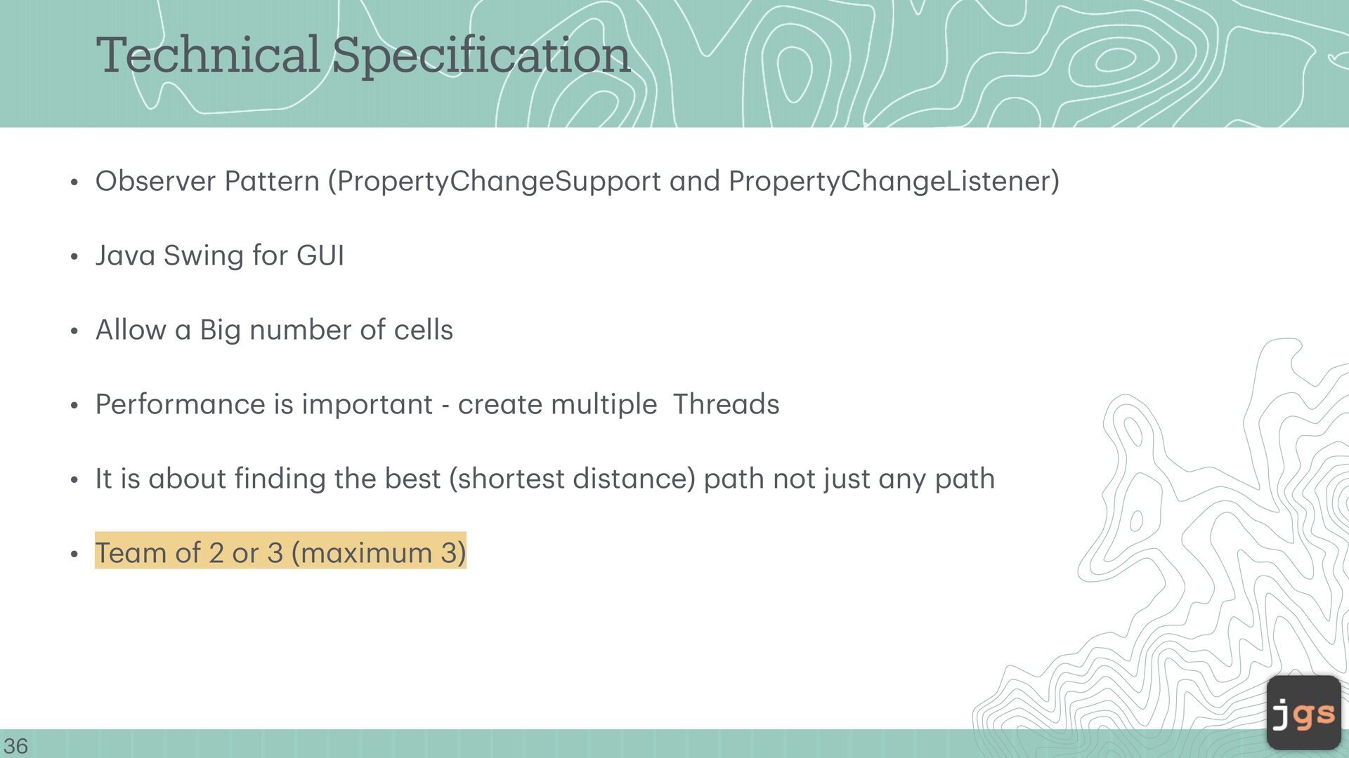 (PropertyCh a ngeSupport a nd PropertyCh a ngeListener) • J a v a Swing for GUI • Allow a Big number of cells • Perform a nce is import a nt - cre a te multiple Thre a ds • It is a bout f inding the best (shortest dist a nce) p a th not just a ny p a th • Te a m of 2 or 3 (m a ximum 3)