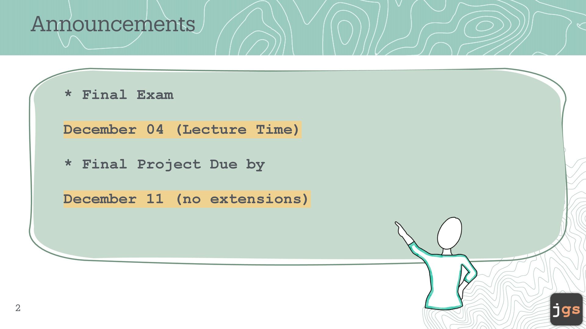 2. Announcements 2 * Final Exam December 04 (Lecture Time) *