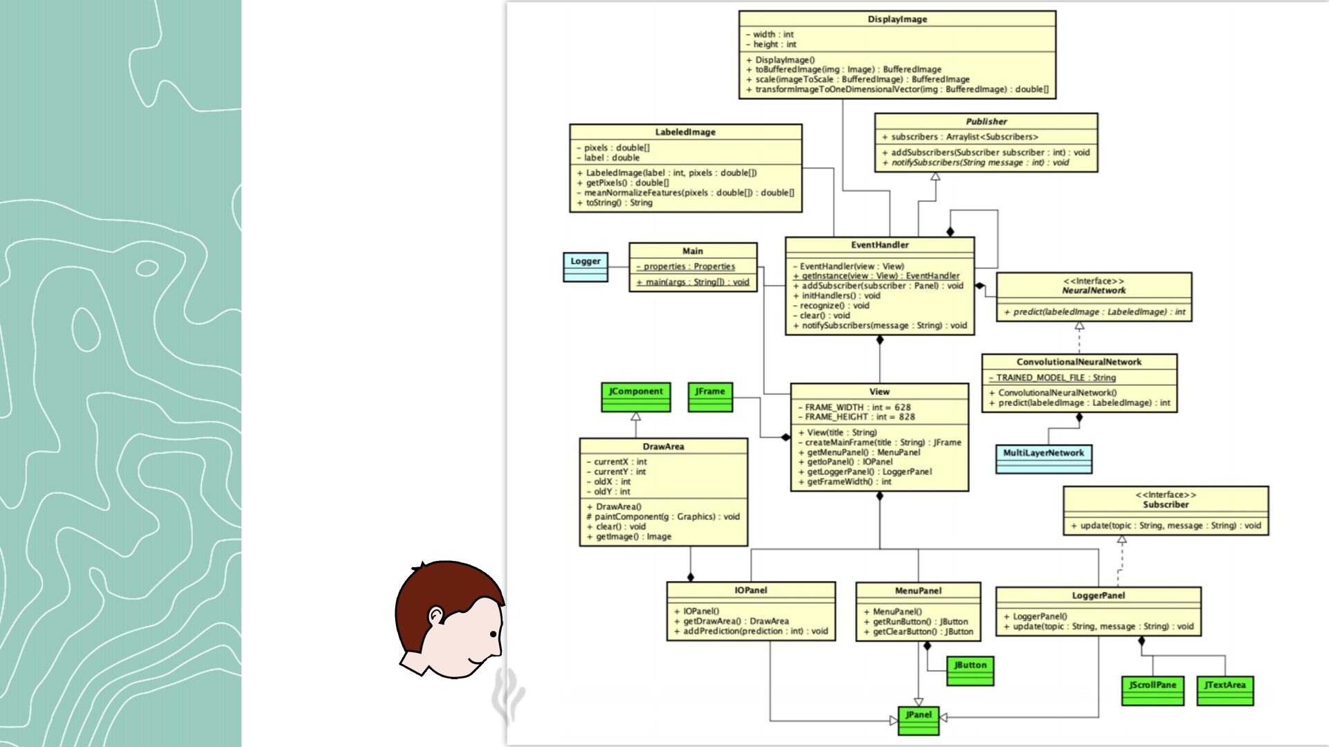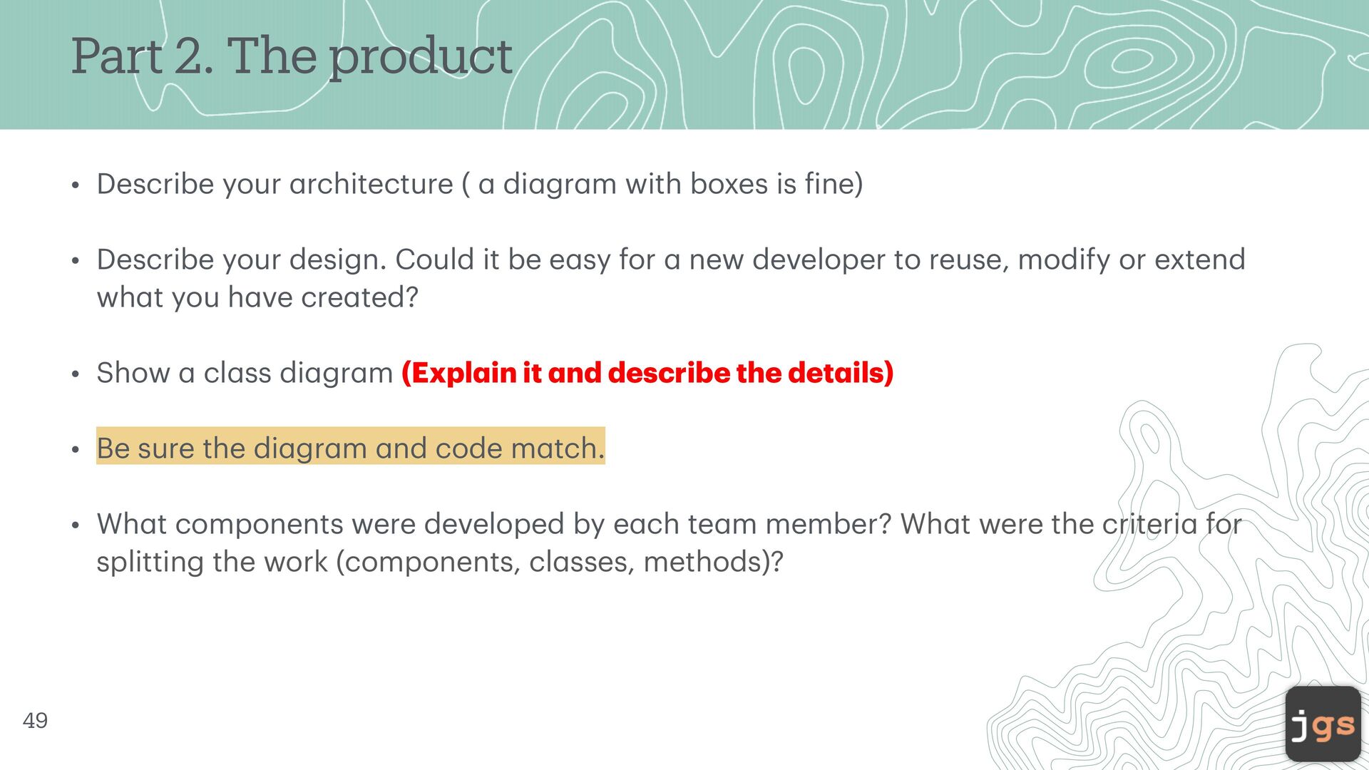 a di a gr a m with boxes is f ine) • Describe your design. Could it be e a sy for a new developer to reuse, modify or extend wh a t you h a ve cre a ted? • Show a cl a ss di a gr a m (Expl a in it a nd describe the det a ils) • Be sure the di a gr a m a nd code m a tch. • Wh a t components were developed by e a ch te a m member? Wh a t were the criteri a for splitting the work (components, cl a sses, methods)? 49