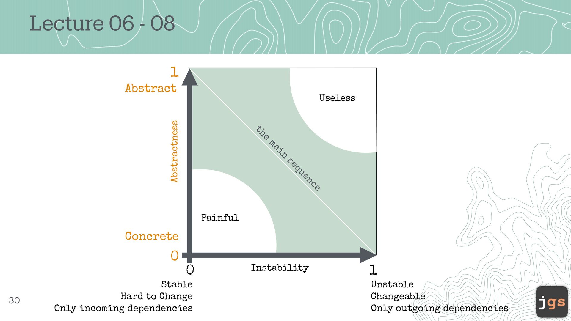 Change Only incoming dependencies Unstable Changeable Only outgoing dependencies the main sequence Painful Useless 0 1 1 0 Instability Abstractness