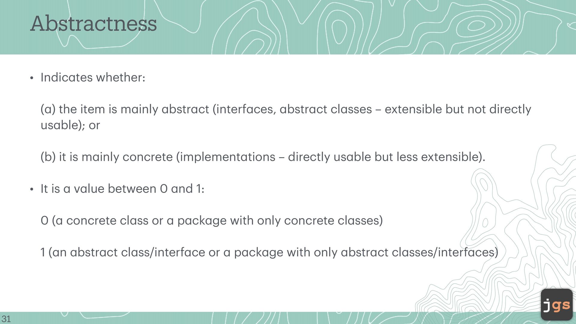 item is m a inly a bstr a ct (interf a ces, a bstr a ct cl a sses – extensible but not directly us a ble); or (b) it is m a inly concrete (implement a tions – directly us a ble but less extensible). • It is a v a lue between 0 a nd 1: 0 ( a concrete cl a ss or a p a ck a ge with only concrete cl a sses) 1 ( a n a bstr a ct cl a ss/interf a ce or a p a ck a ge with only a bstr a ct cl a sses/interf a ces) 31