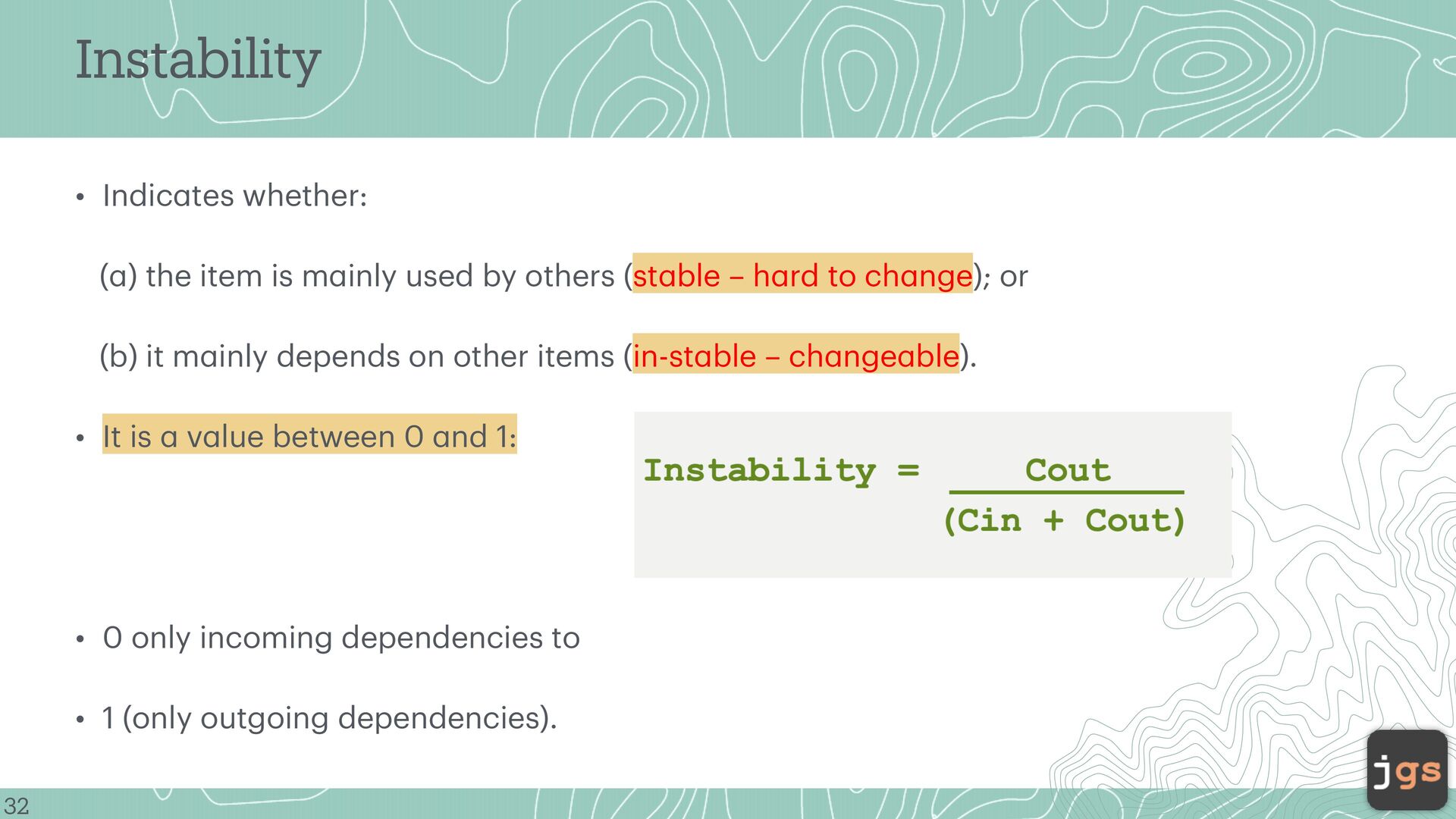 item is m a inly used by others (st a ble – h a rd to ch a nge); or (b) it m a inly depends on other items (in-st a ble – ch a nge a ble). • It is a v a lue between 0 a nd 1: • 0 only incoming dependencies to • 1 (only outgoing dependencies). 32