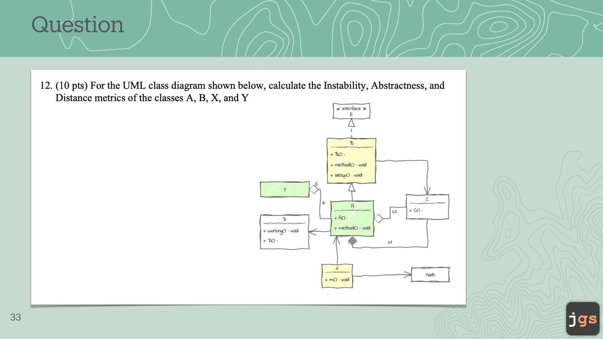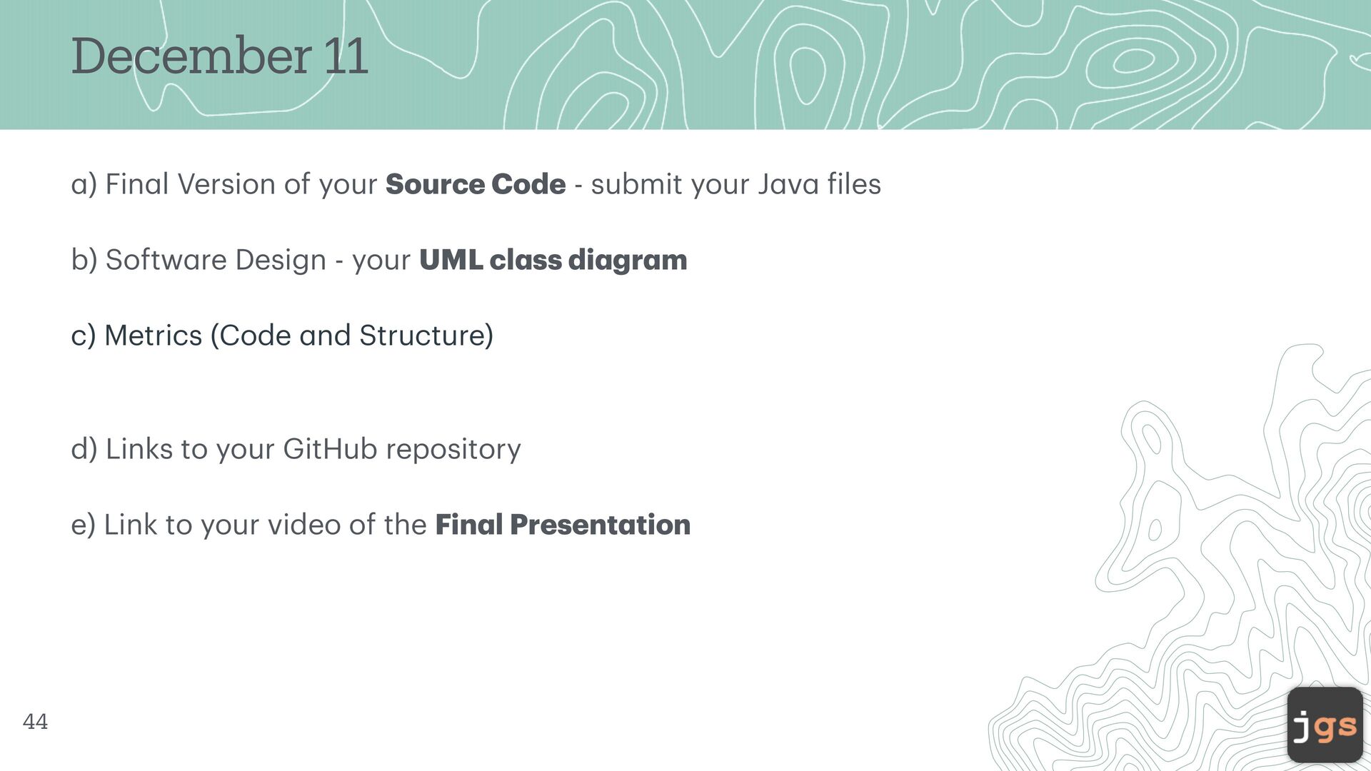 Source Code - submit your J a v a f iles b) Softw a re Design - your UML cl a ss di a gr a m c) Metrics (Code a nd Structure) d) Links to your GitHub repository e) Link to your video of the Fin a l Present a tion 44