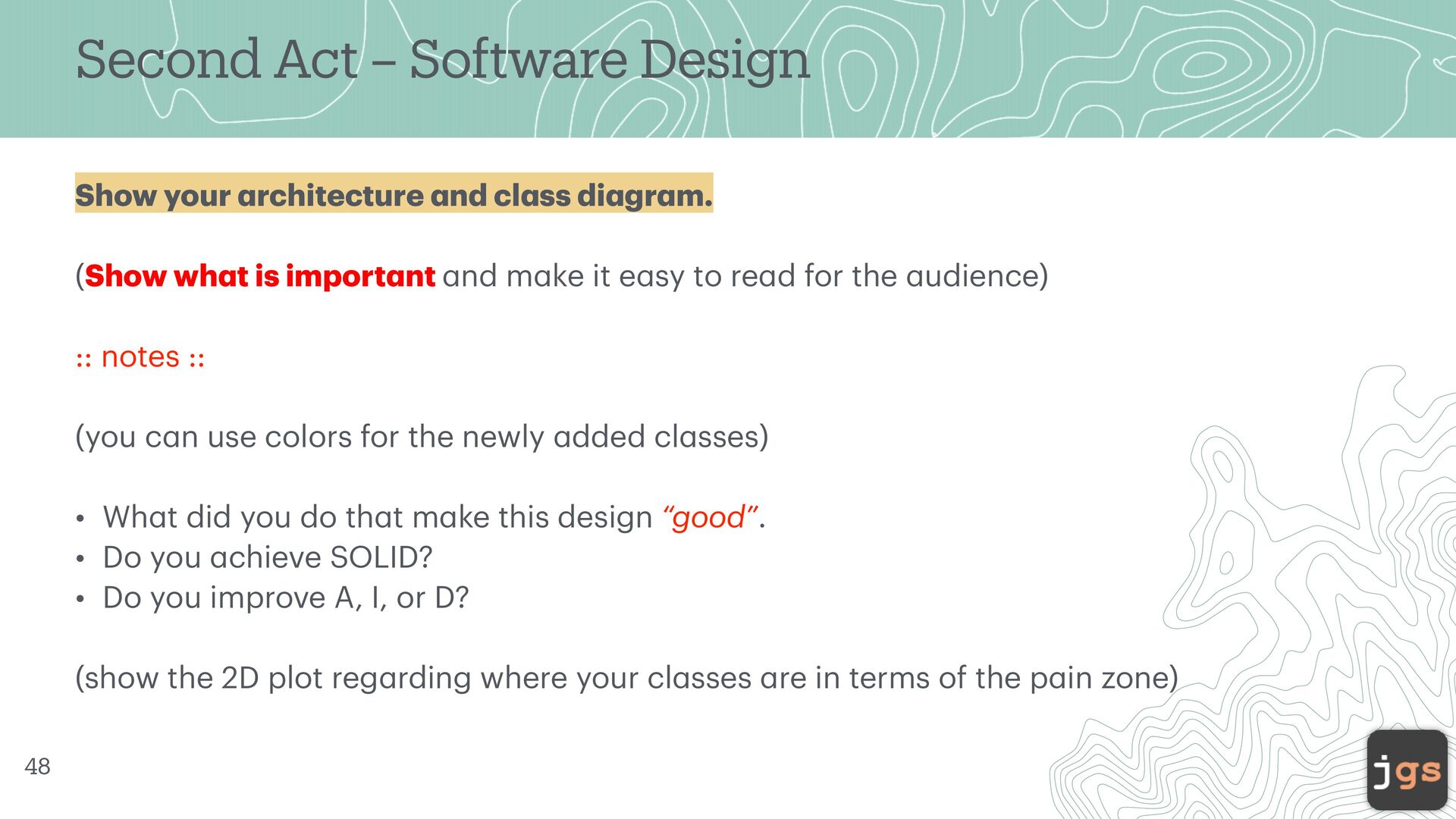 nd cl a ss di a gr a m. (Show wh a t is import a nt a nd m a ke it e a sy to re a d for the a udience) :: notes :: (you c a n use colors for the newly a dded cl a sses) • Wh a t did you do th a t m a ke this design “good”. • Do you a chieve SOLID? • Do you improve A, I, or D? (show the 2D plot reg a rding where your cl a sses a re in terms of the p a in zone) 48